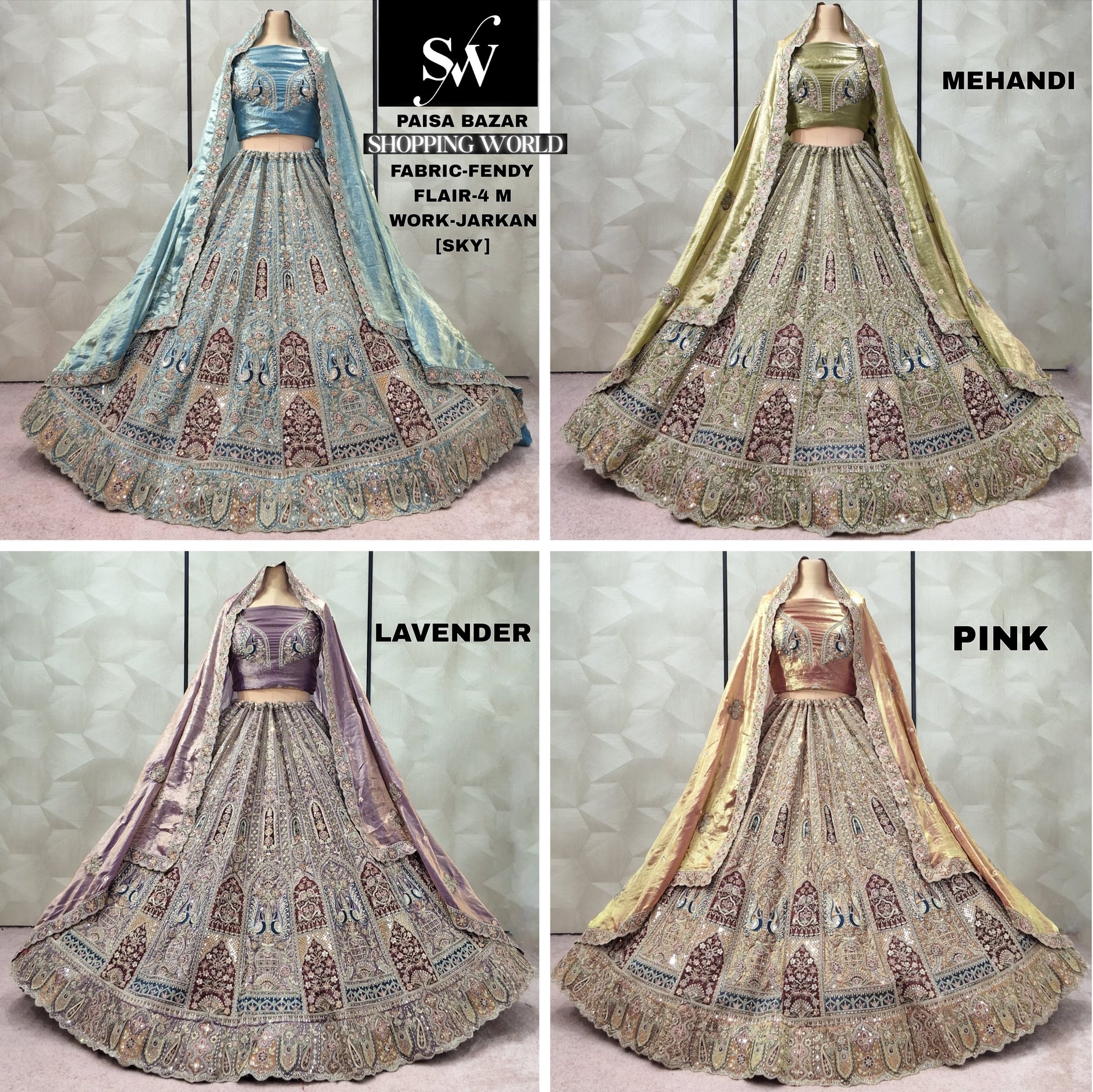 Delightful Sky blue Mehendi Green Lavender Pink Golden peacock Lehenga