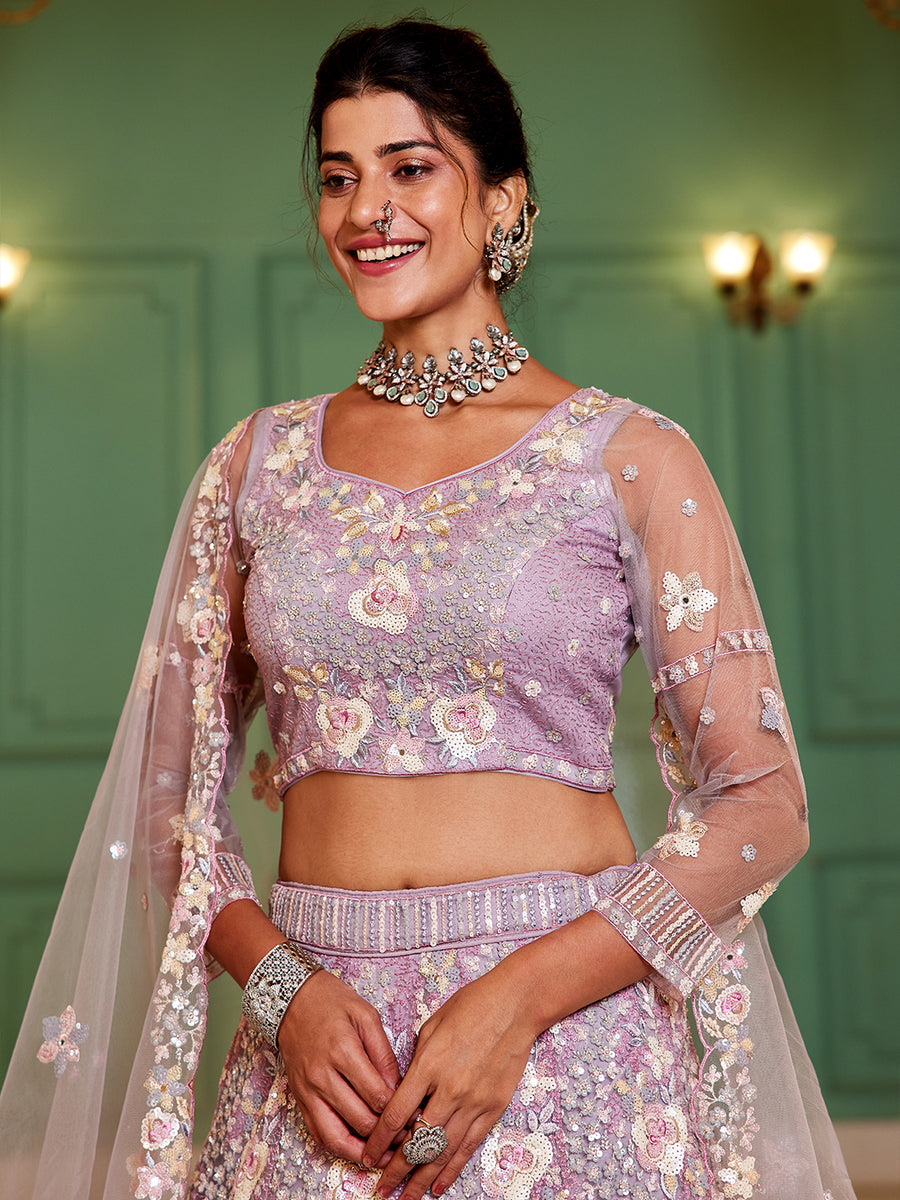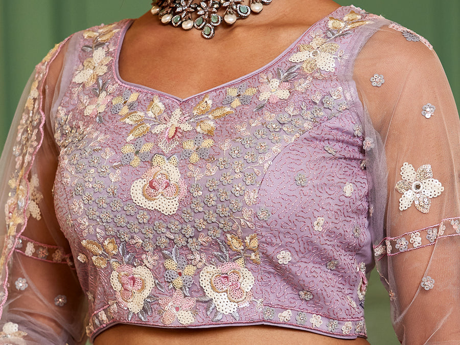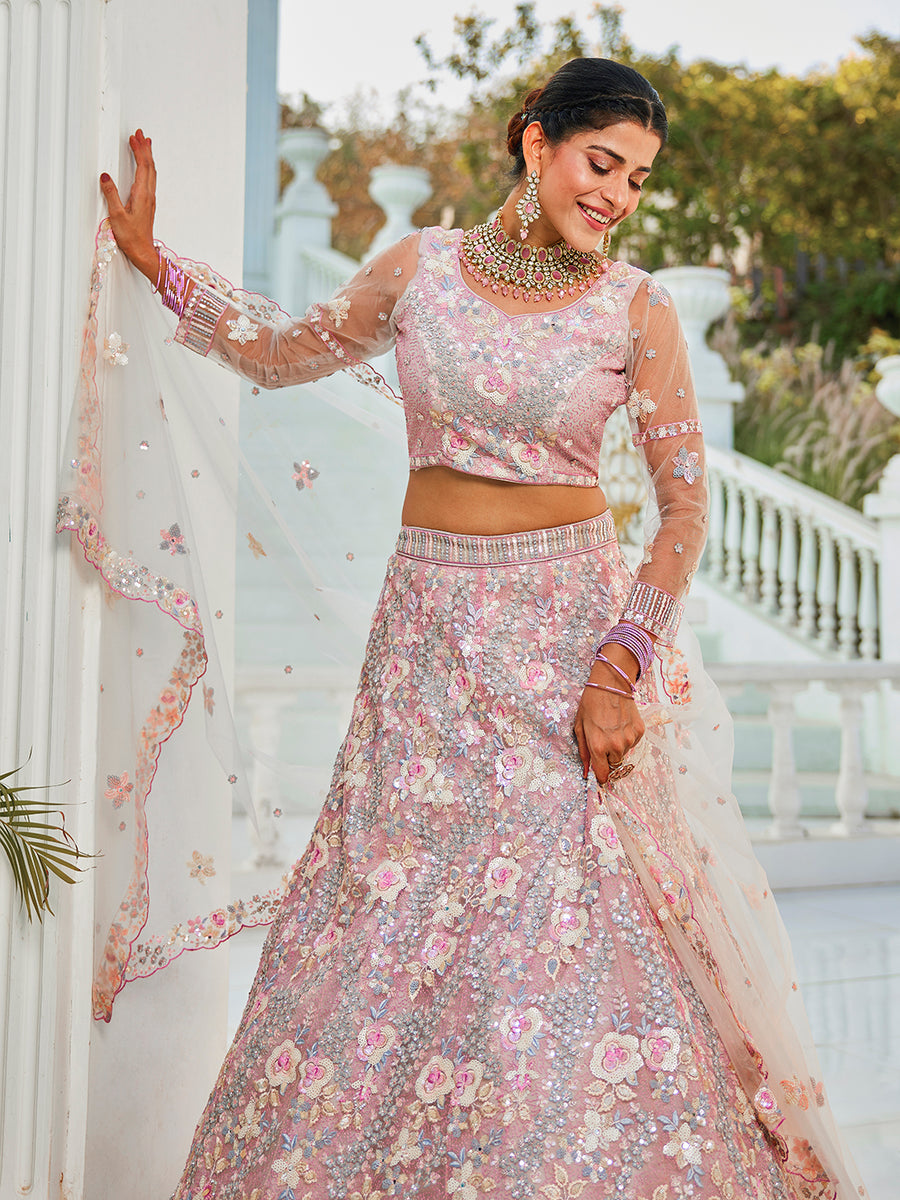 الترتر الوردي متعدد الألوان يعمل ثقيل الأزهار المطرزة باستخدام Zarkan & Mirror Lehenga