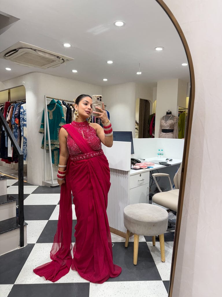 Embellished Red Rani pink Dark blue Black Blue yellow peach drape Saree Lehenga