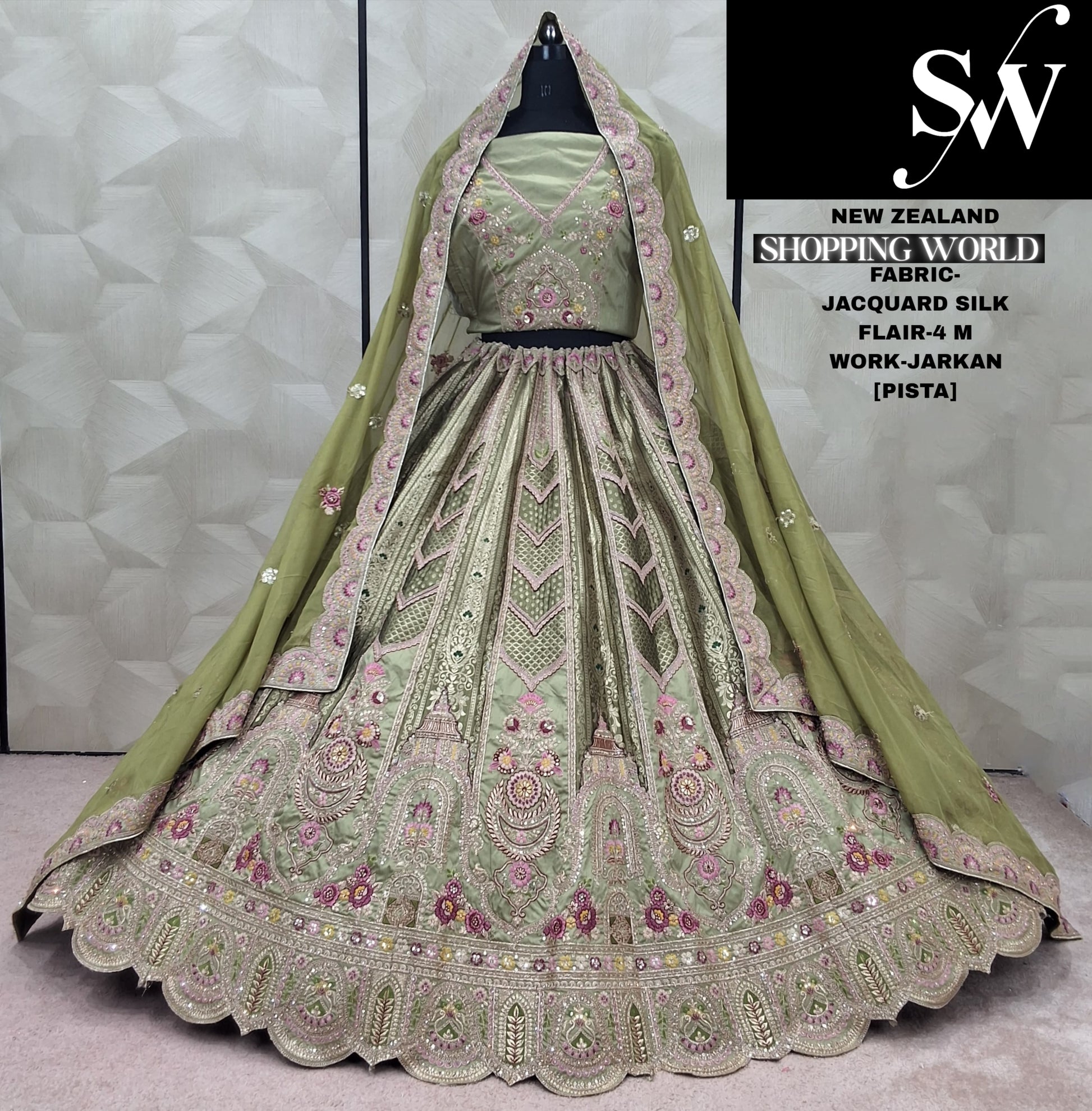 Engaging pista green Jarkan Work Jacquard Silk Lehenga