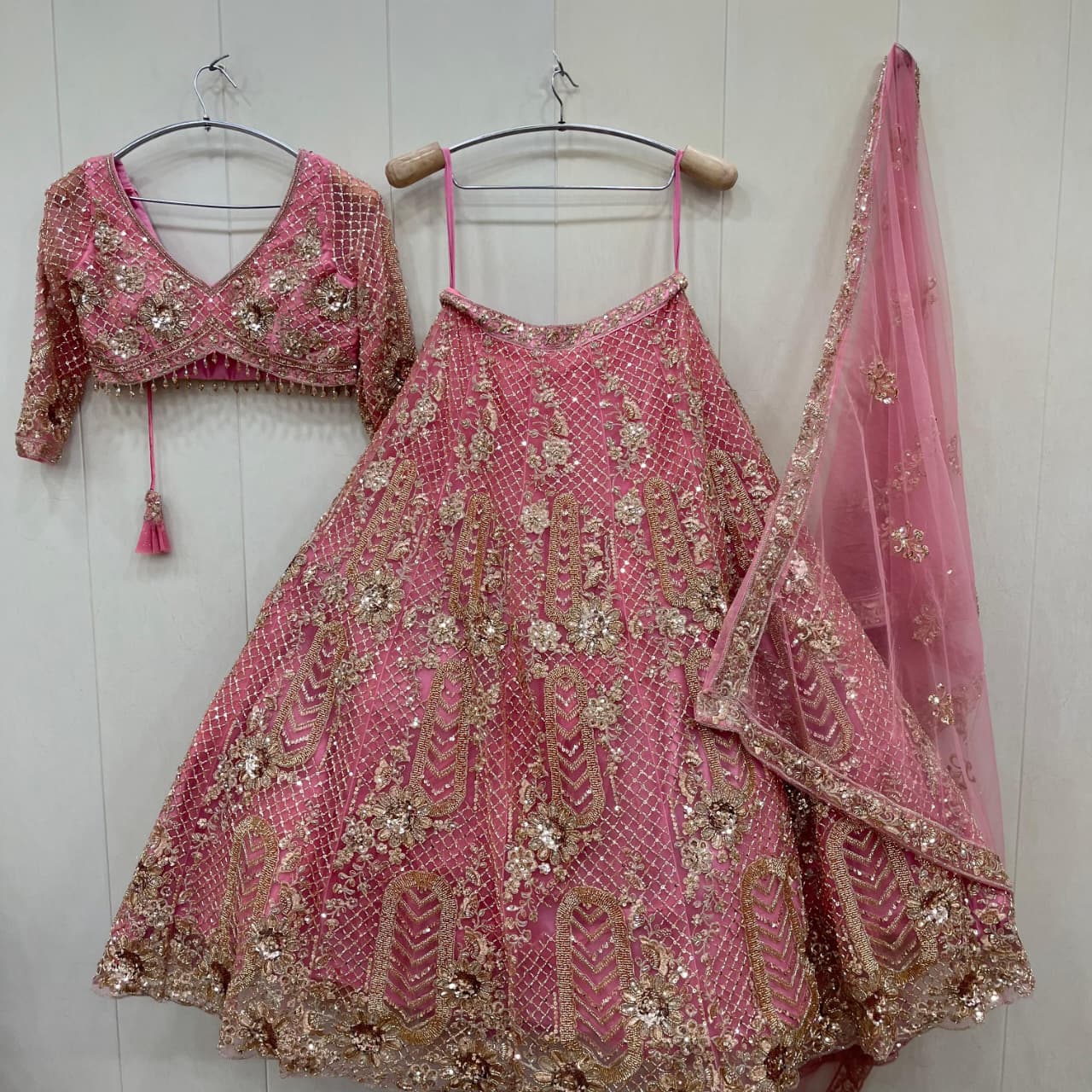 Glamorous Rani pink peacock Double dupatta Silk Bridal Lehenga happy customer