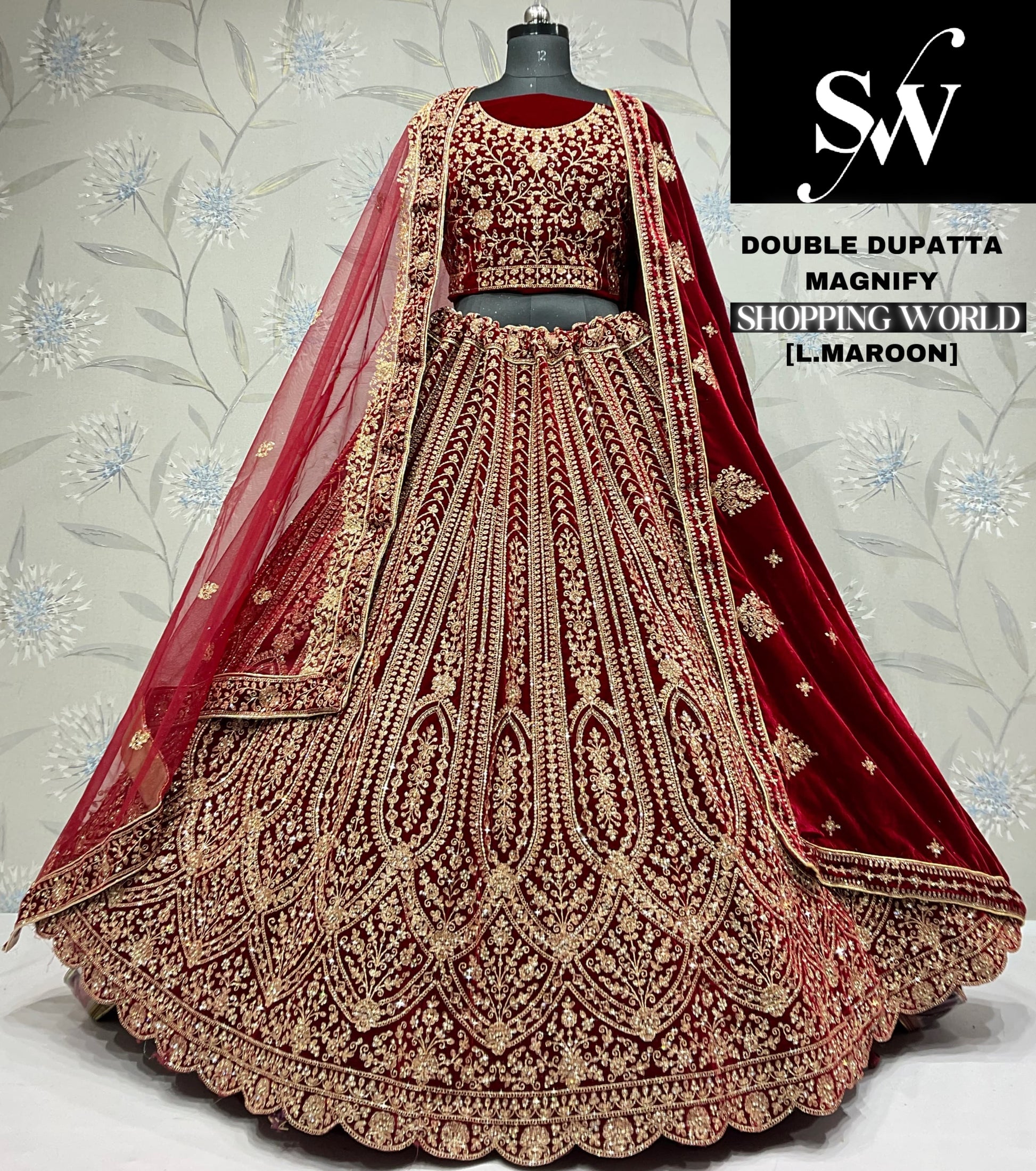 Awesome light maroon Velvet double dupatta bridal Lehenga