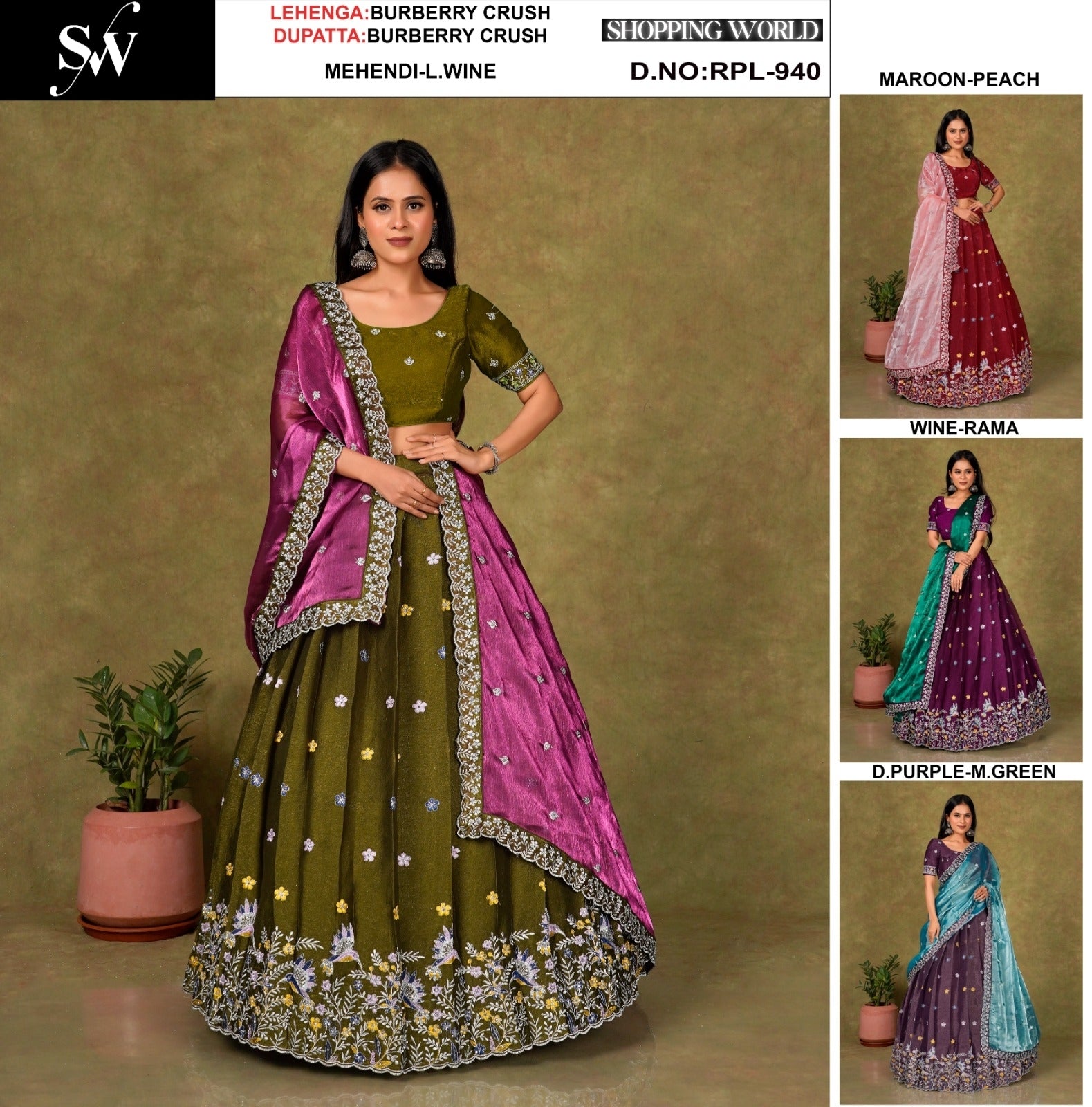 Eye Catching Mehendi green Maroon Wine Dark purple Burberry Crush Crop Top Lehenga