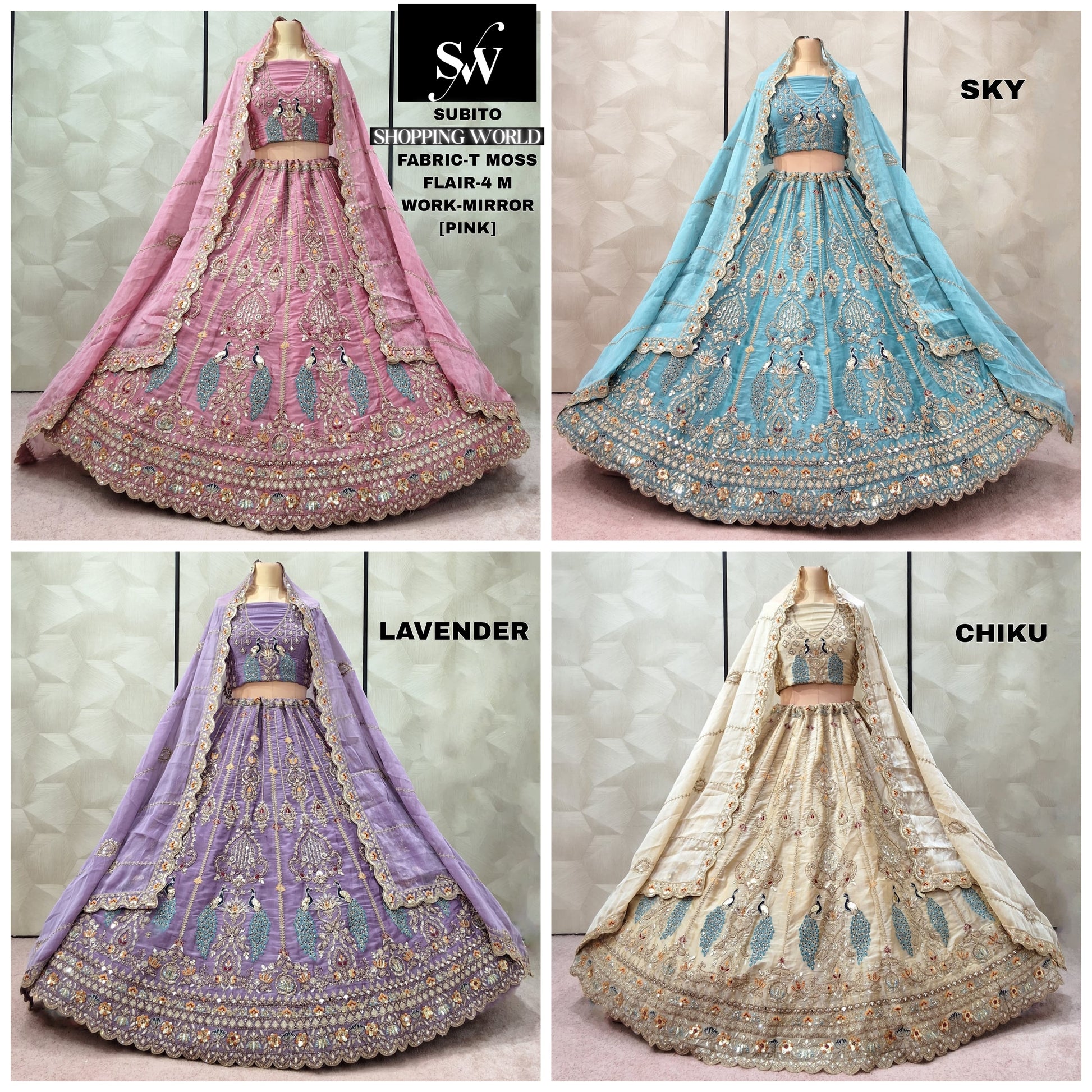 Fabulous Pink Sky blue Lavender Chiku golden Peacock Net Lehenga