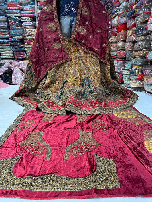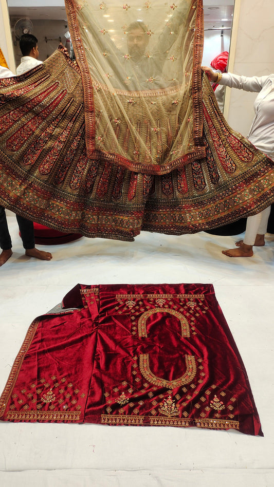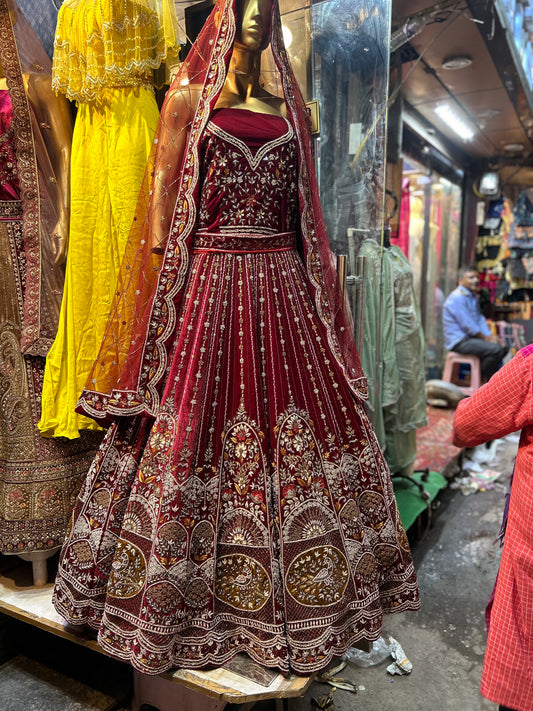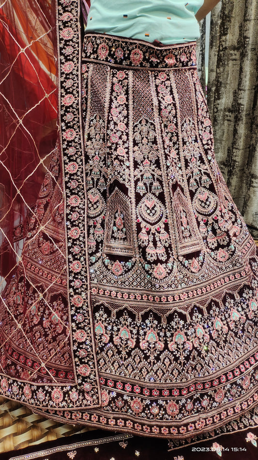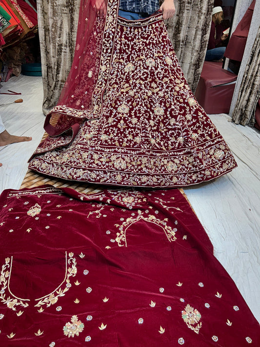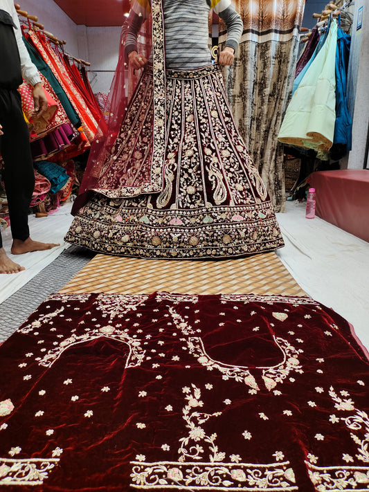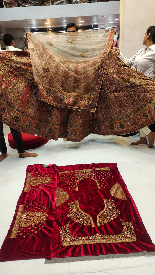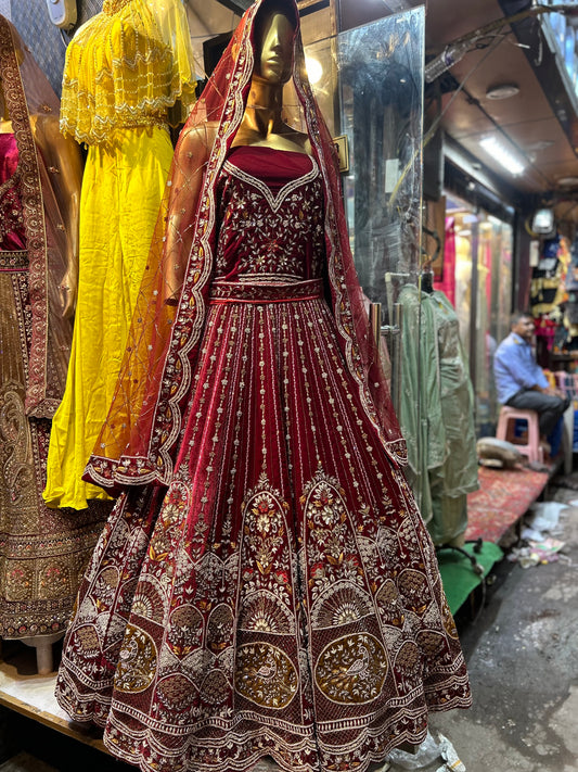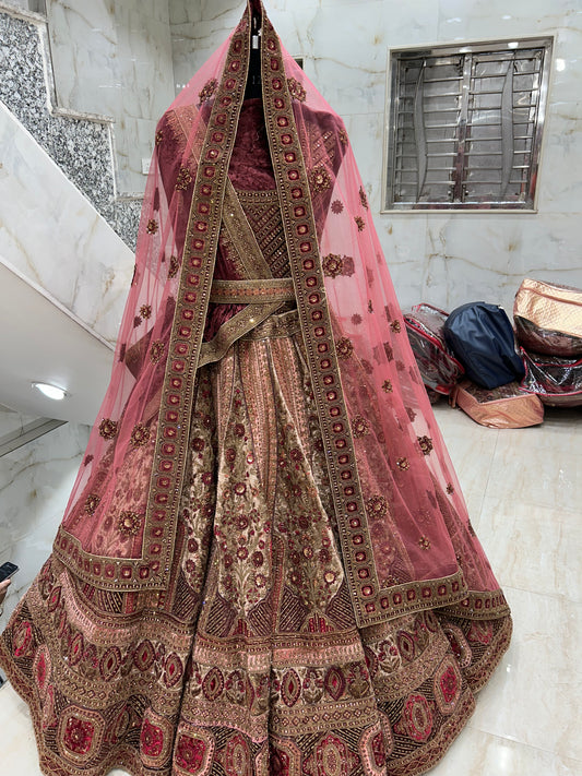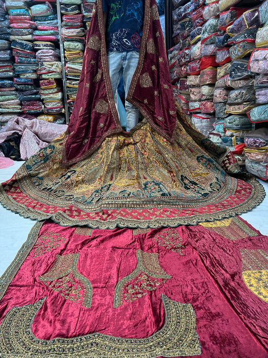 Khoobsurat maroon peacock Double Duptta Velvet Bridal Lehenga