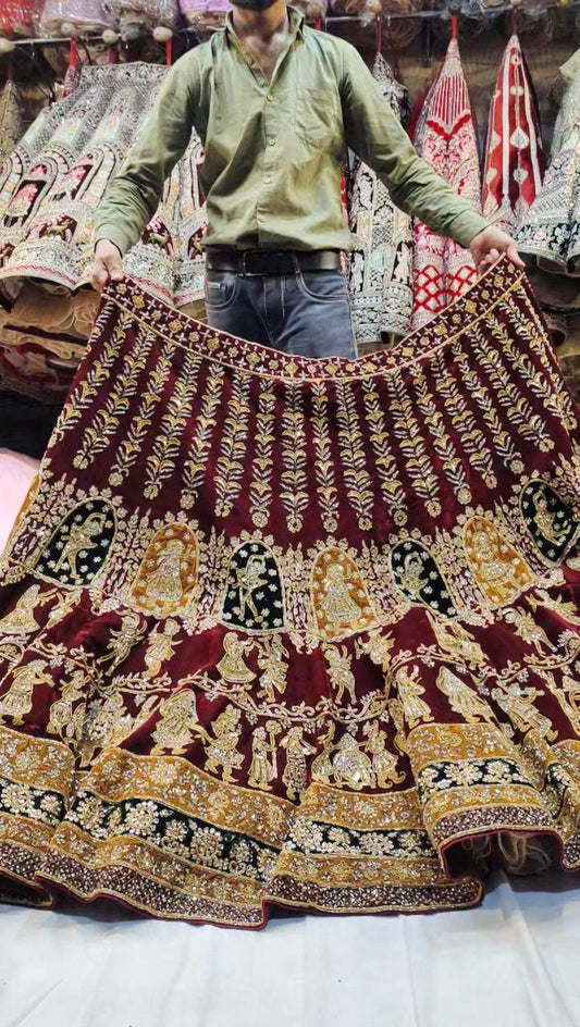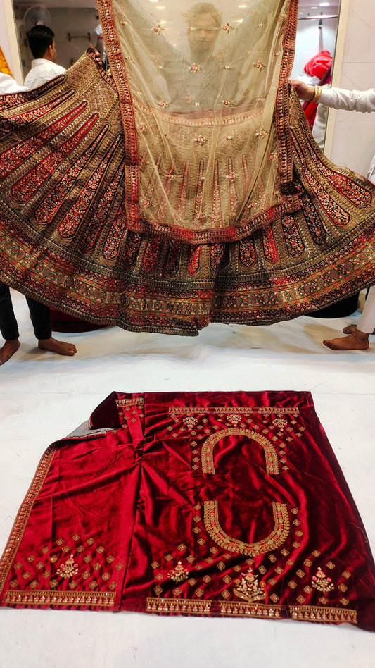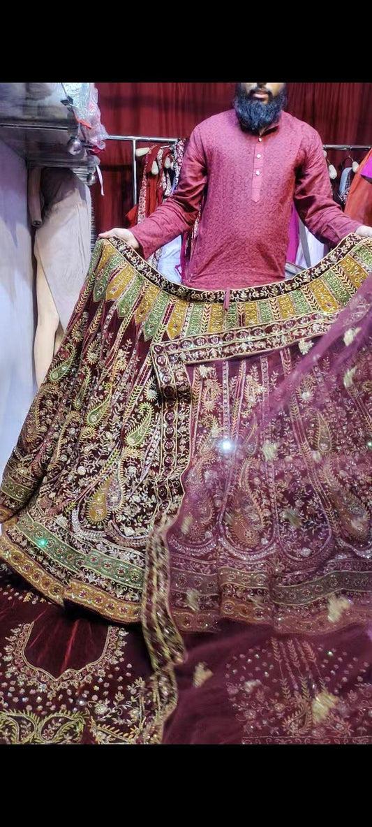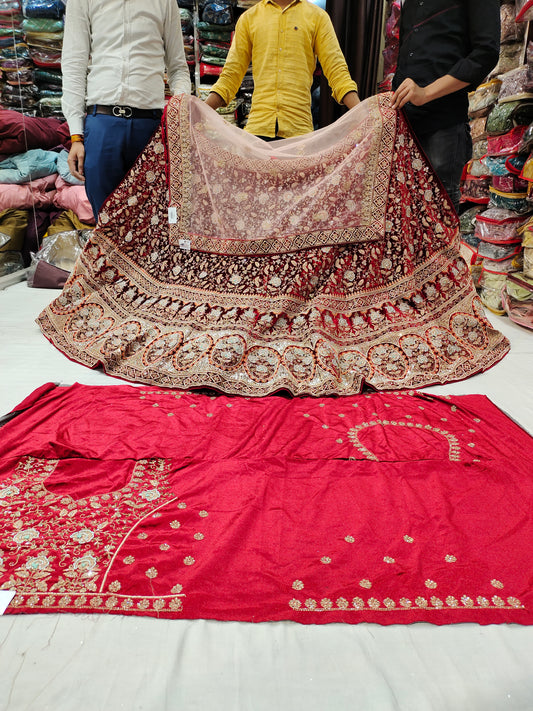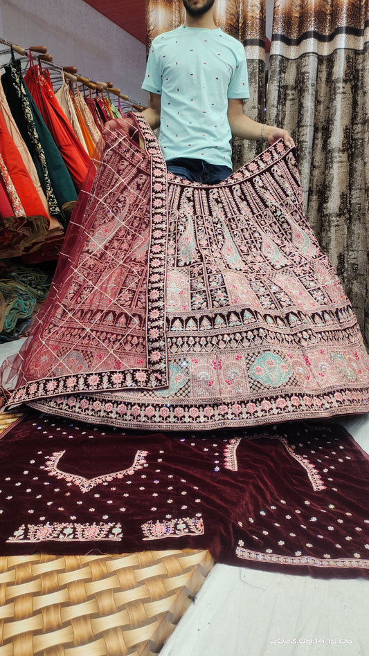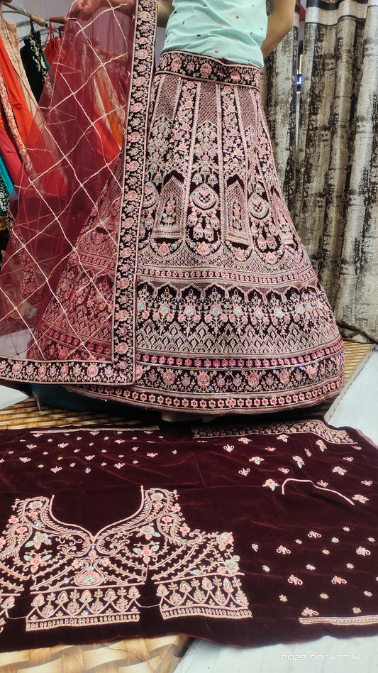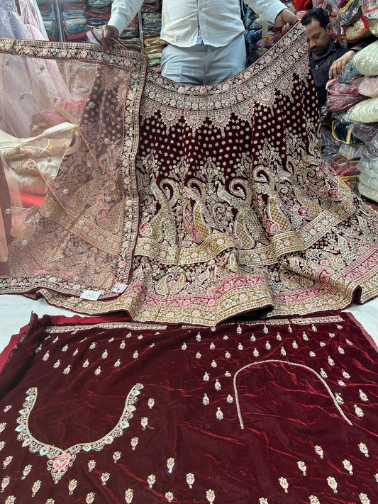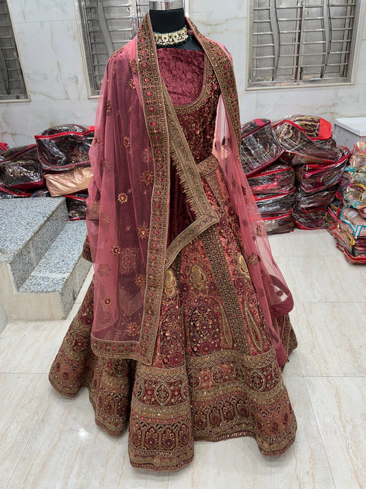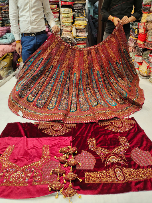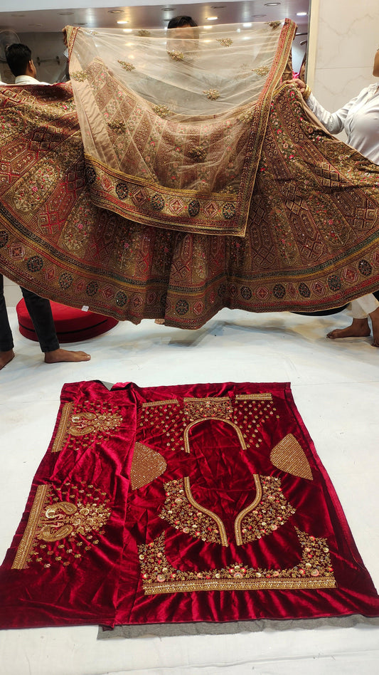 Khoobsurat maroon peacock Double Duptta Velvet Bridal Lehenga
