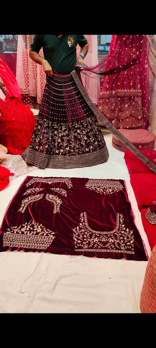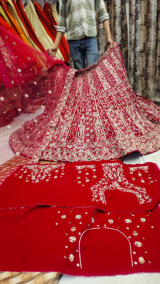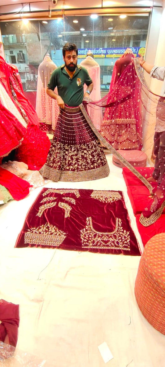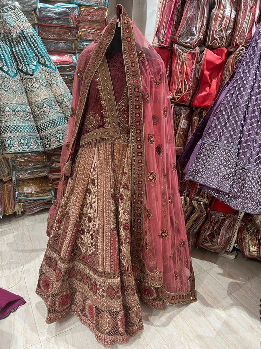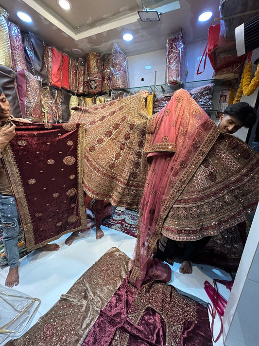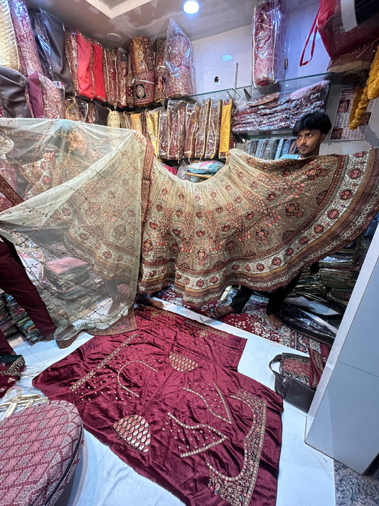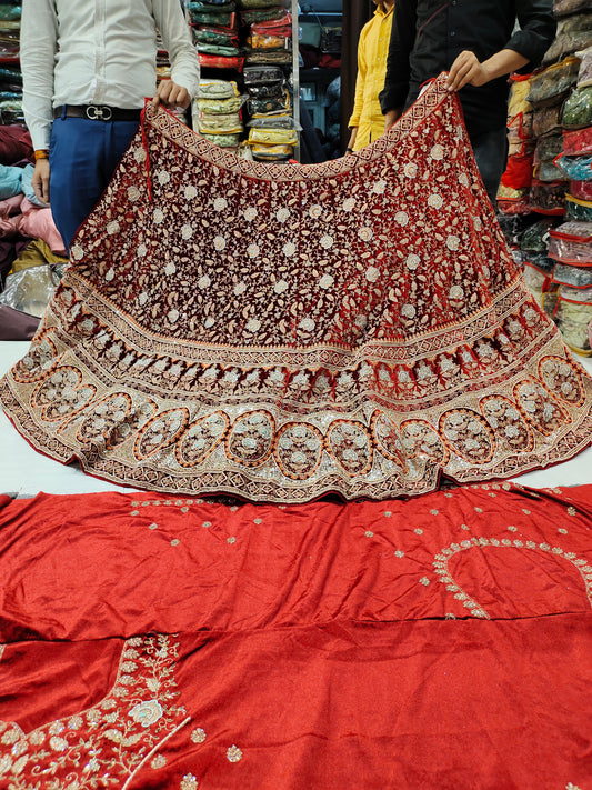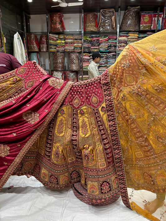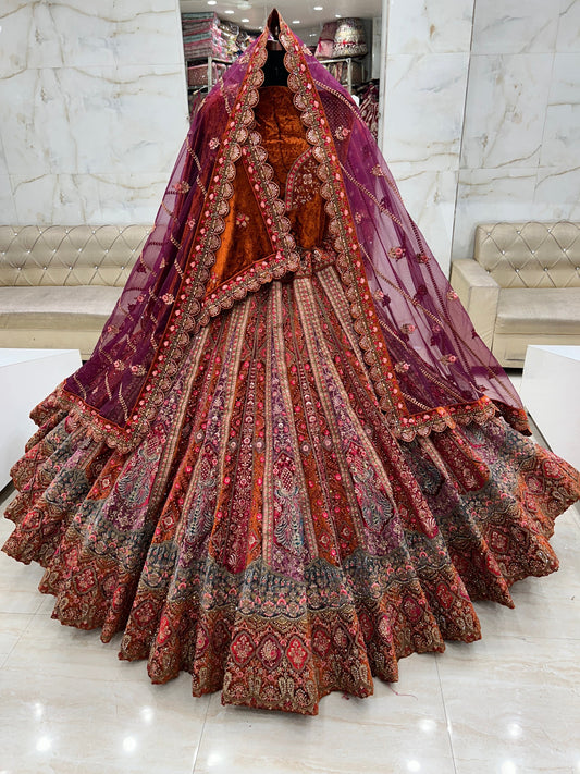 Khoobsurat maroon peacock Double Duptta Velvet Bridal Lehenga