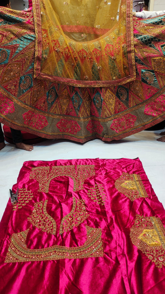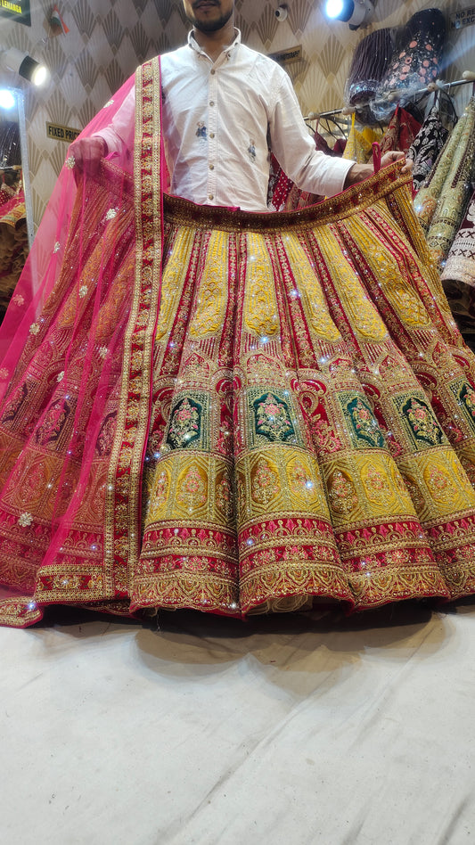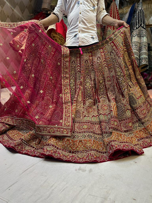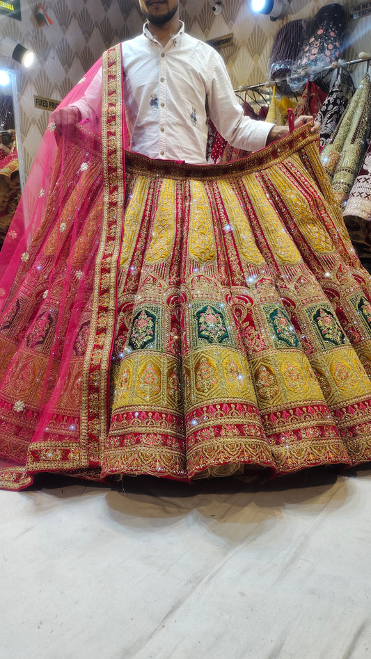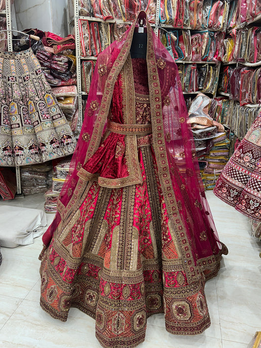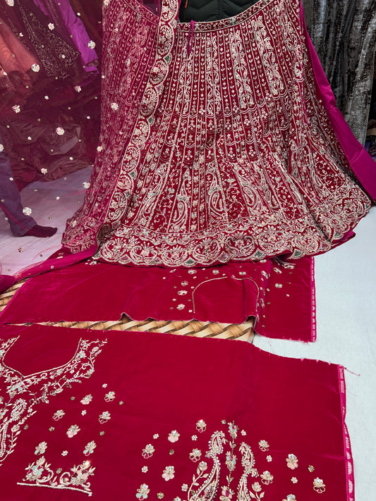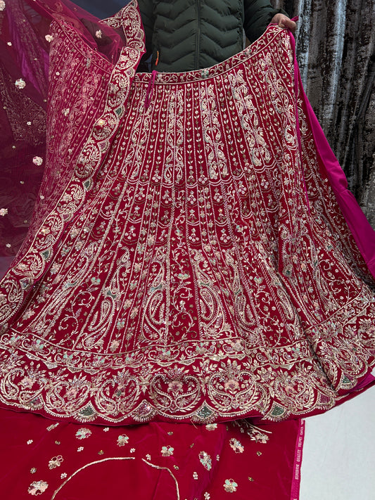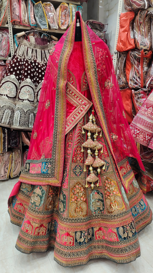 Beautiful Rani pink peacock Double Duptta Velvet Bridal Lehenga