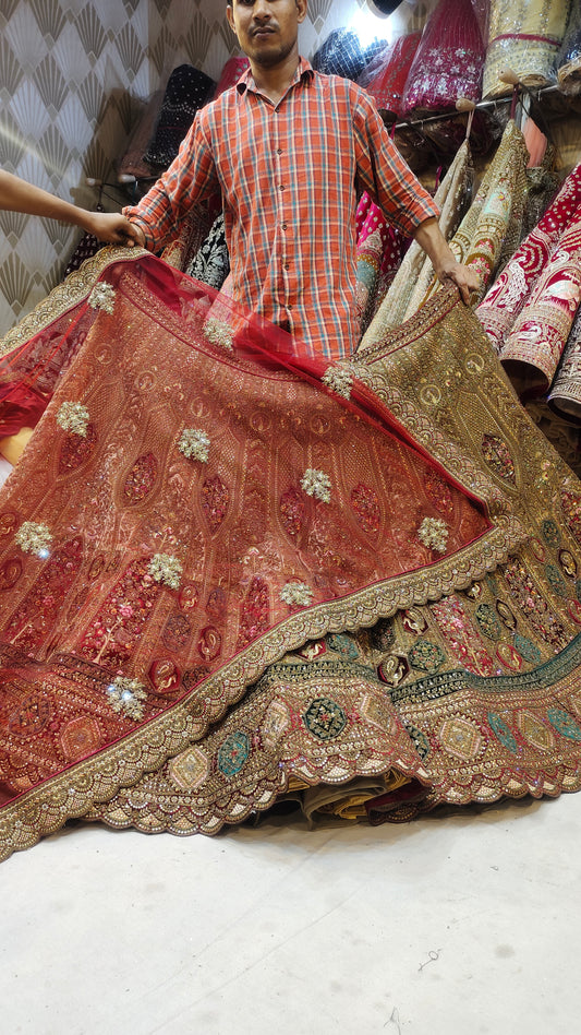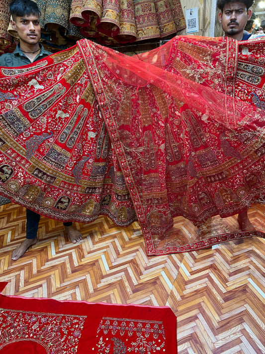 Gorgeous red peacock Double Dupatta Silk Bridal Lehenga