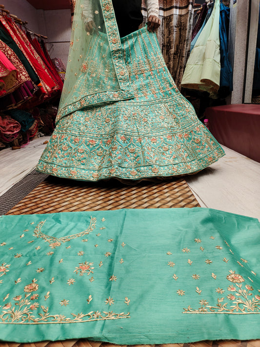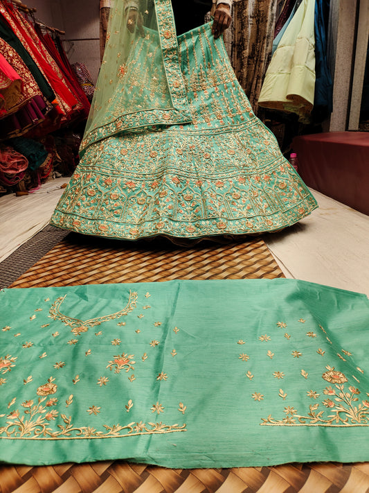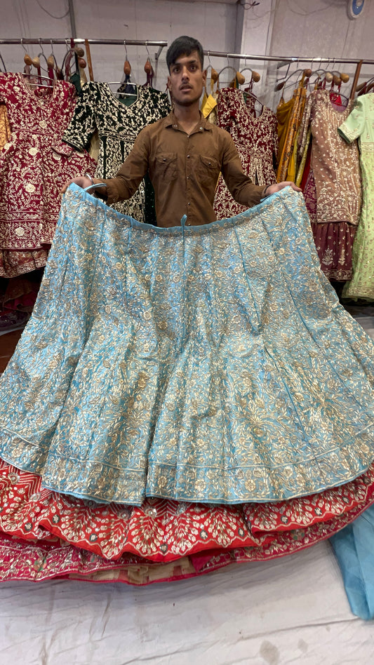GAURAV GUPTA stunning designer outfit in a beautiful ice-blue shade, crafted with complete hand work on both front and back fish-cut crop top lehenga
