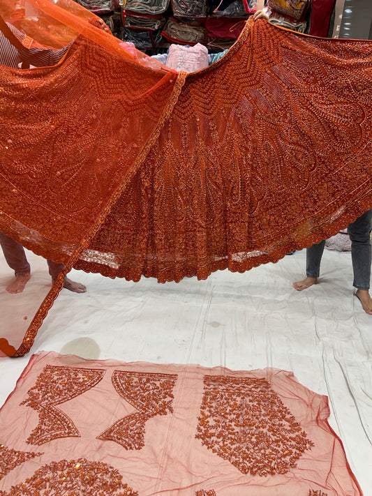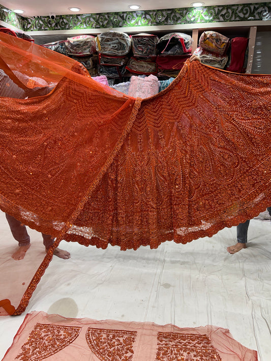Attractive Rust orange peacock Double Duptta Silk Bridal lehenga