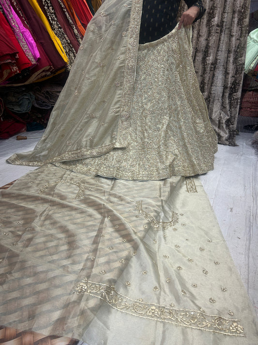 Elegant Beige Ivory color Wedding Lehenga with Leaf Embroidery Silk lehenga with Soft Net dupatta 2144