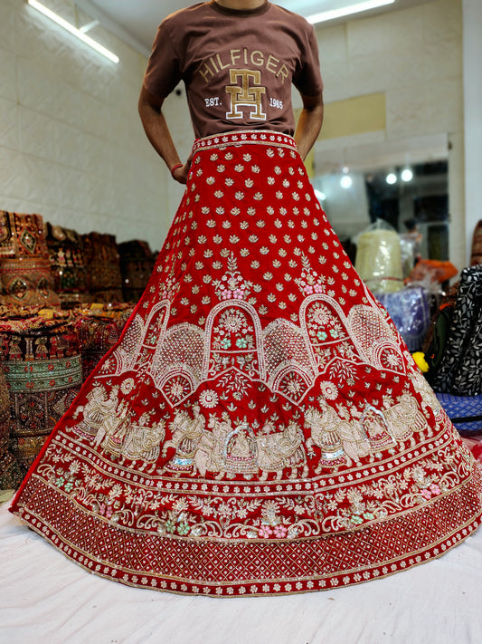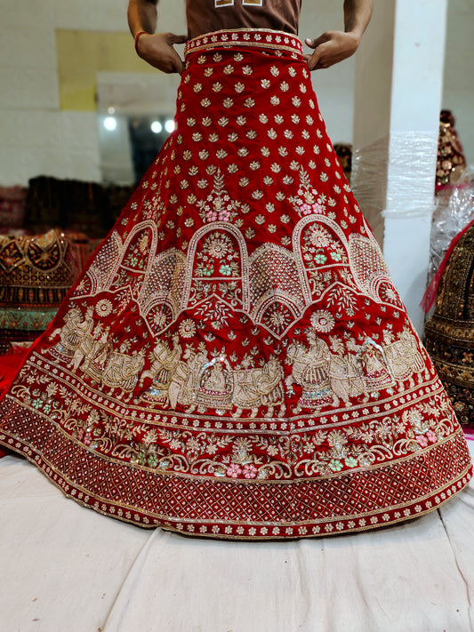 Good looking Red Double Dupatta Velvet Bridal Lehenga