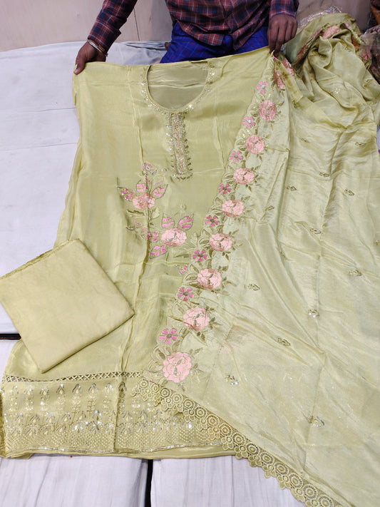 Glamorous yellow pink unstitched salwar suit dress material (free size)
