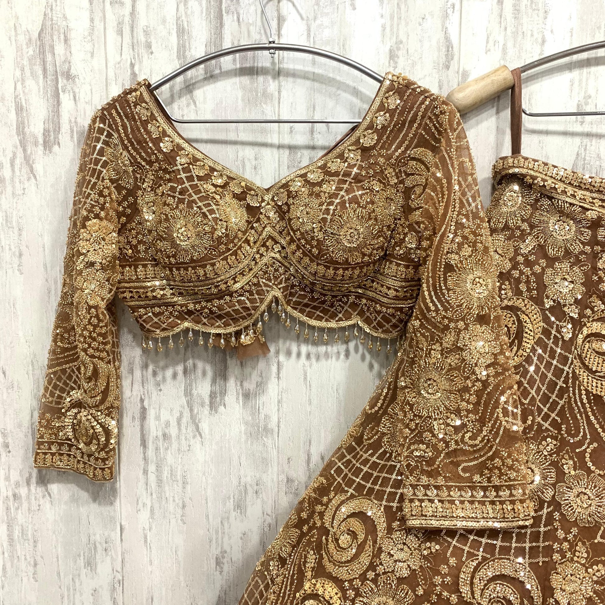 Elegante lehenga de novia color mostaza (cliente satisfecha)