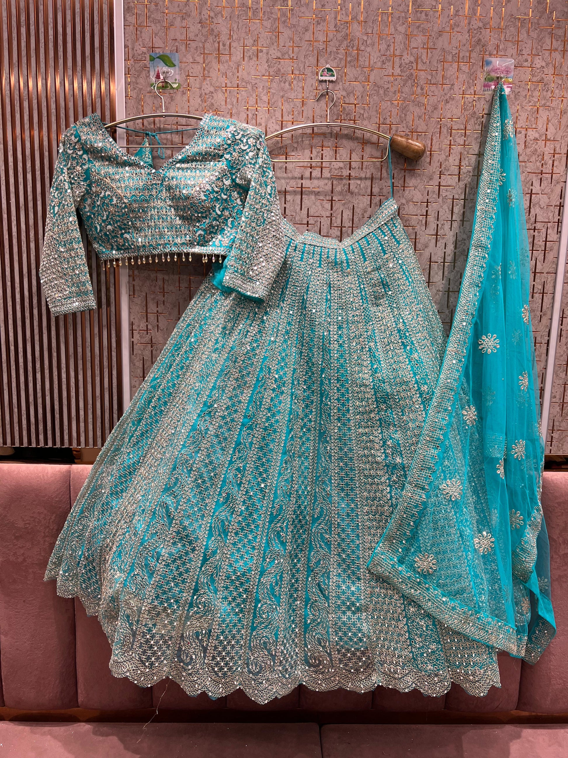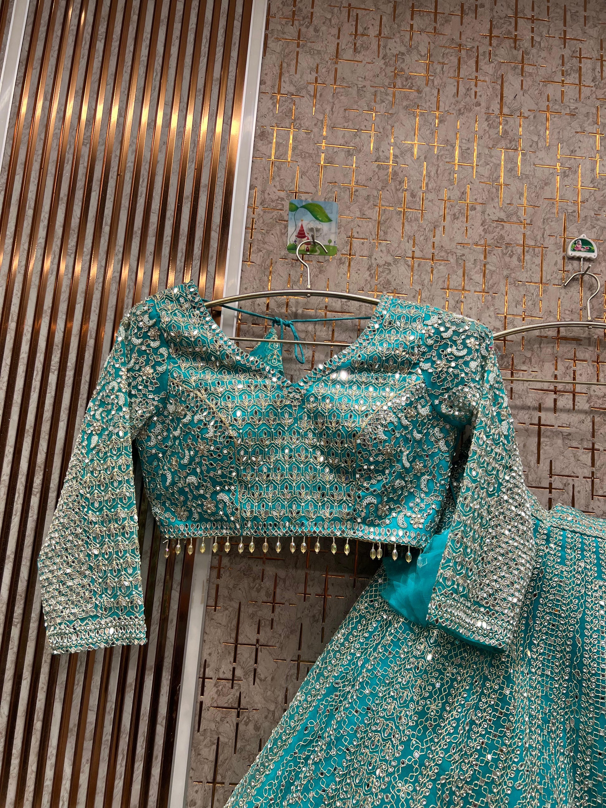 Lehenga con crop top azul cielo y atractivo trabajo de espejos gotta patti.