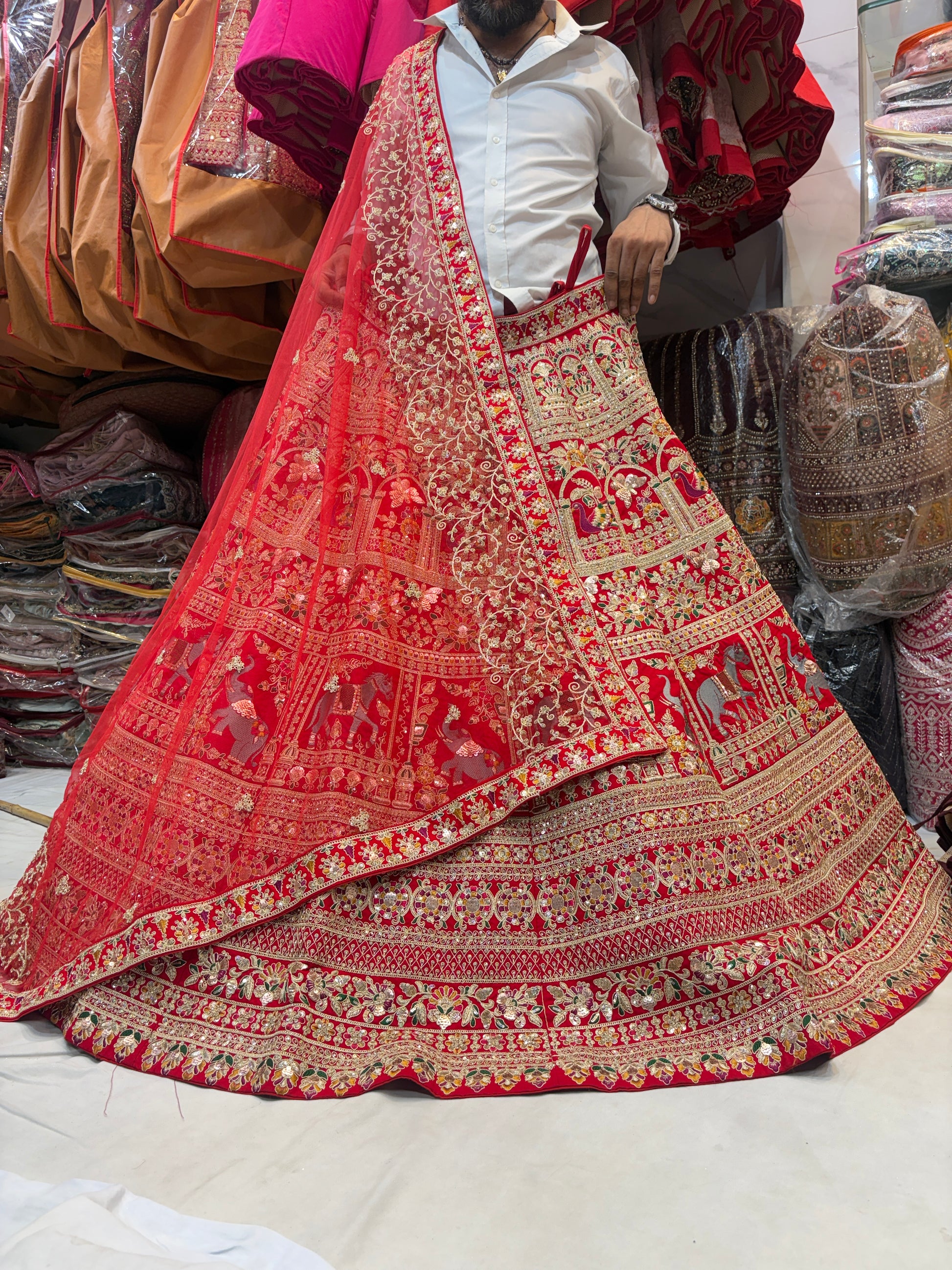 Lehenga nupcial rojo real con doble cola y dupatta a juego.