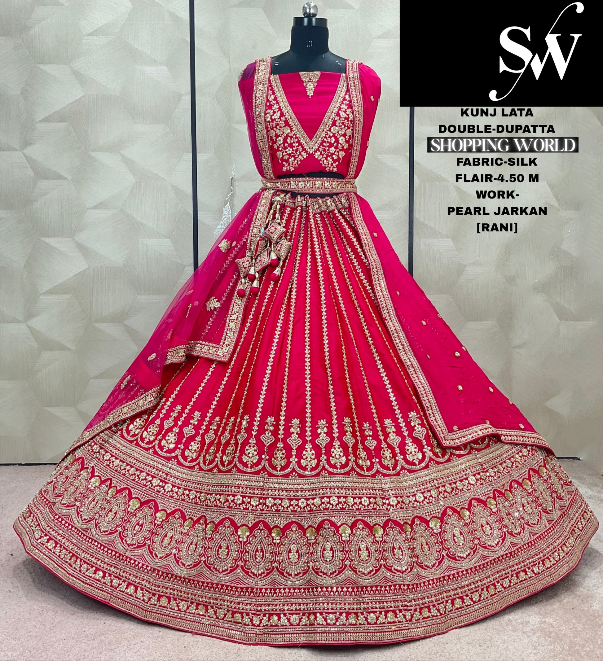 Lehenga nupcial de seda con doble dupatta, color rosa pavo real glamuroso.
