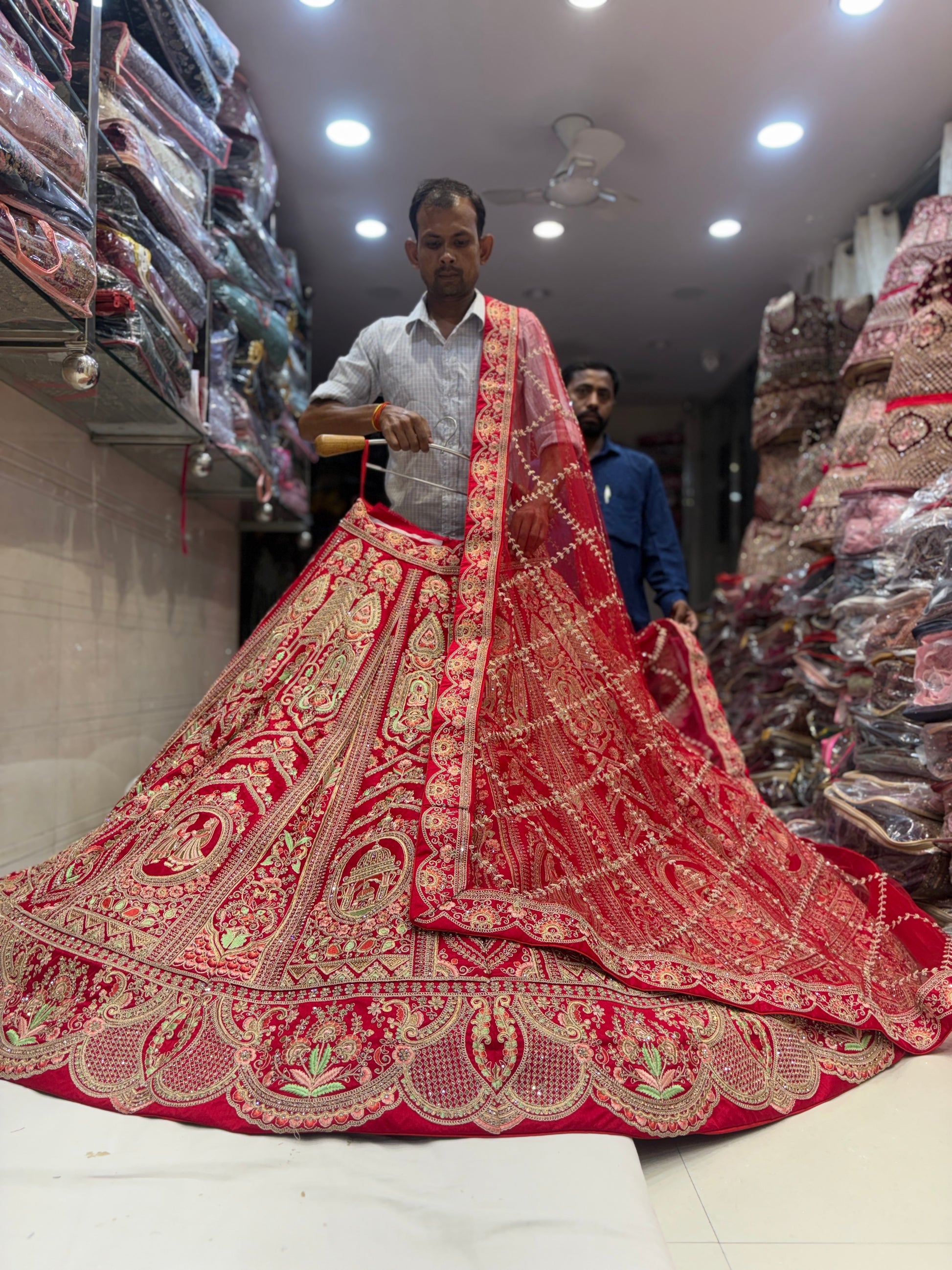 Lehenga nupcial rojo real con doble cola y dupatta a juego.