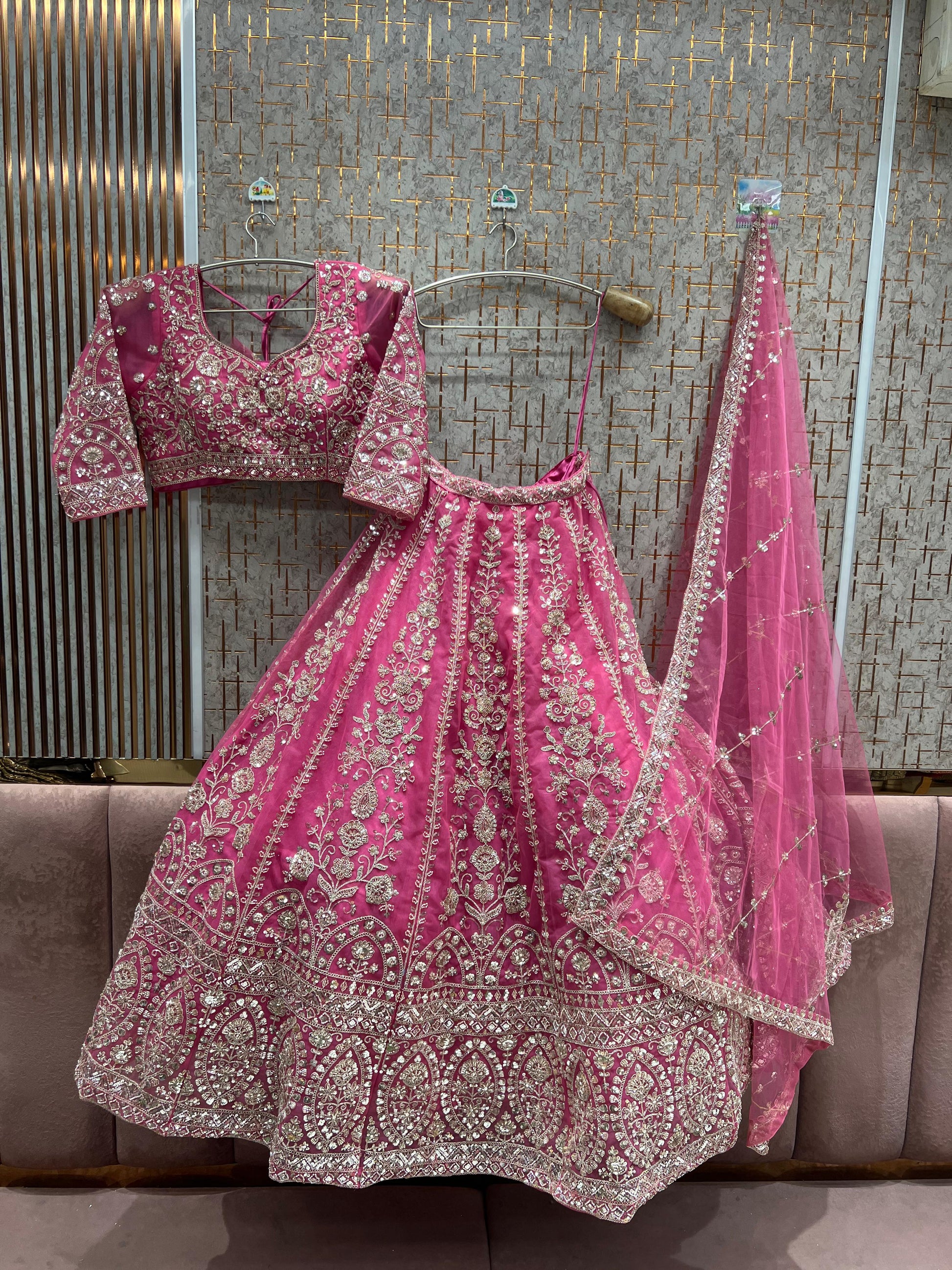 Lehenga nupcial de seda con doble dupatta, color rosa pavo real glamuroso.