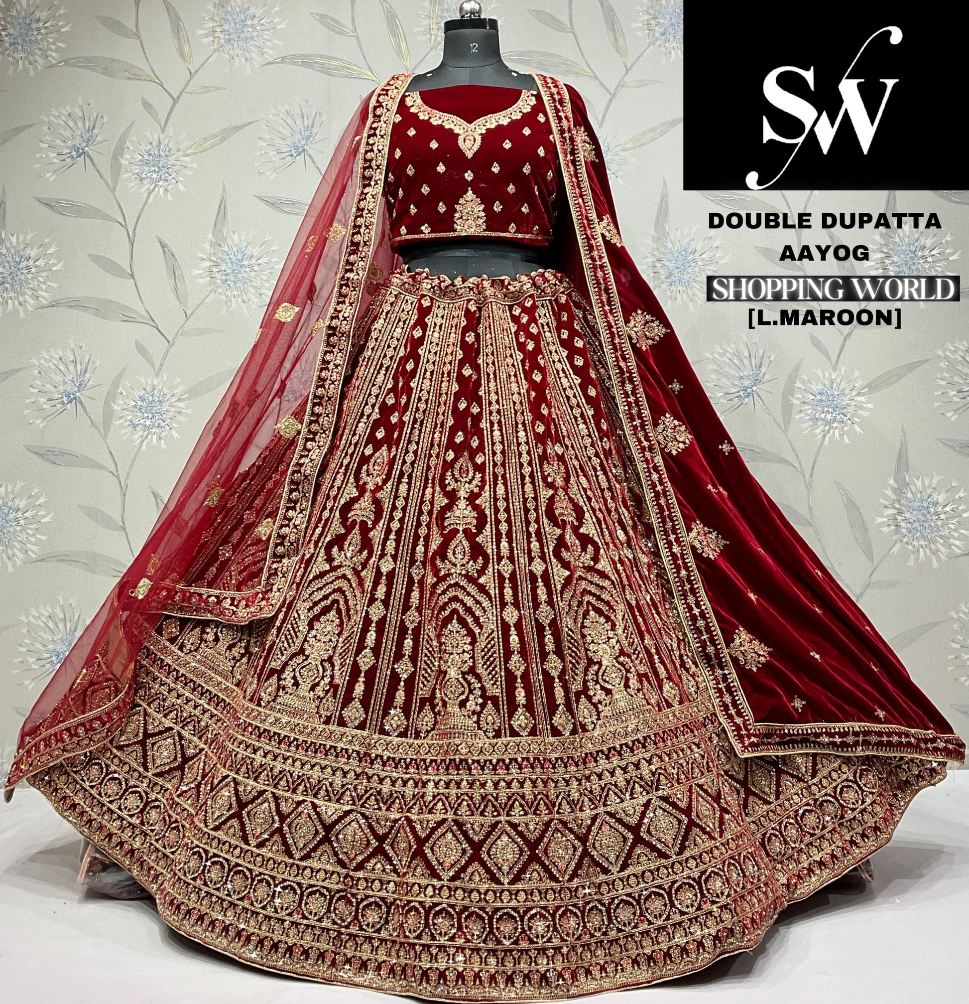 Designer light maroon Velvet double dupatta bridal Lehenga