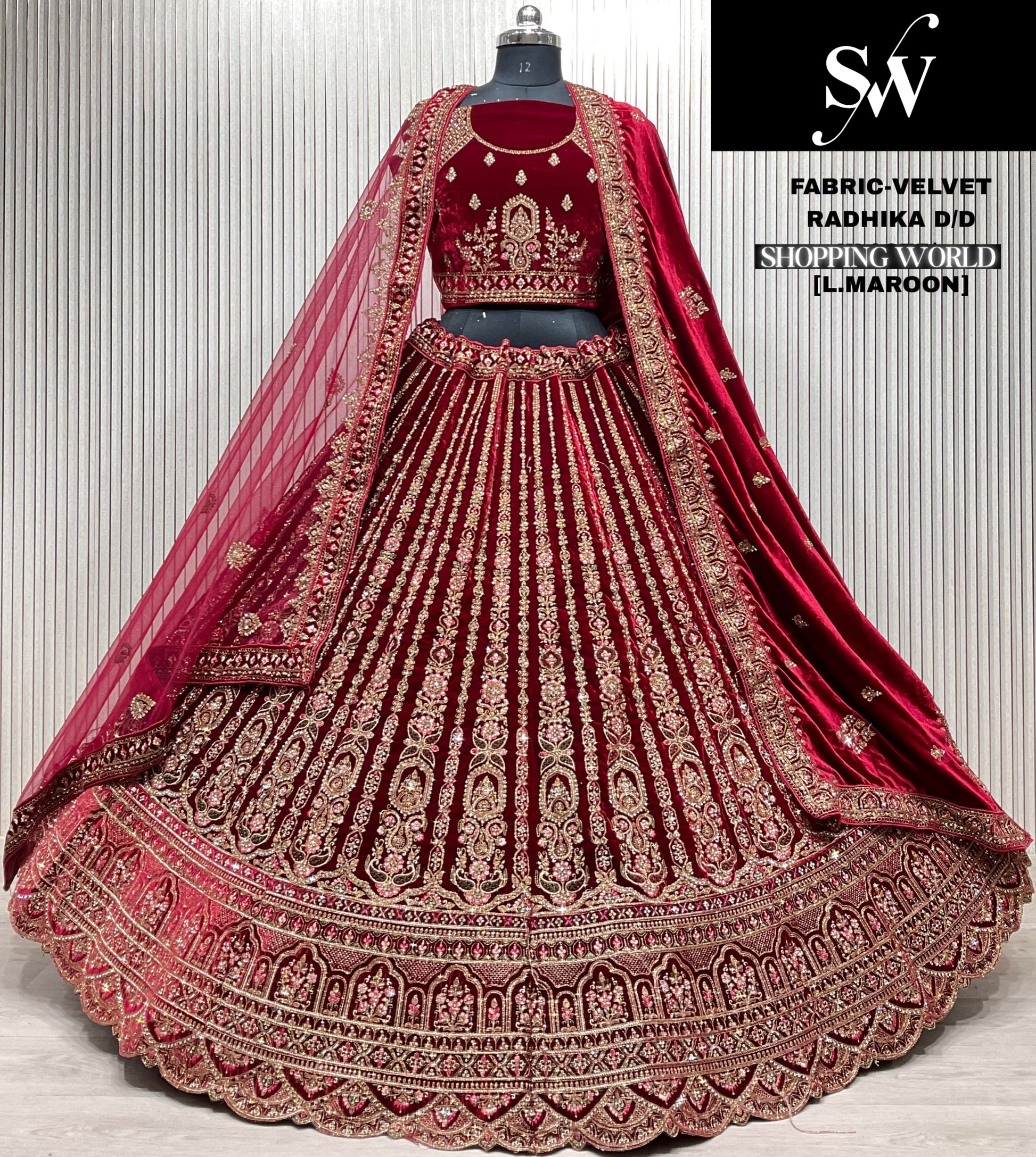 Fantastic Dark maroon Double duptta Velvet Bridal Lehenga