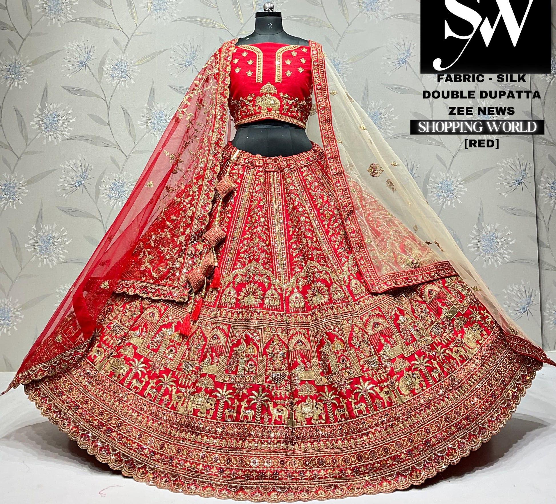 हैवी ब्राइडल रॉयल रजवाड़ा लहंगा लाल 6 मीटर फ्लेयर डबल दुपट्टा सिल्क