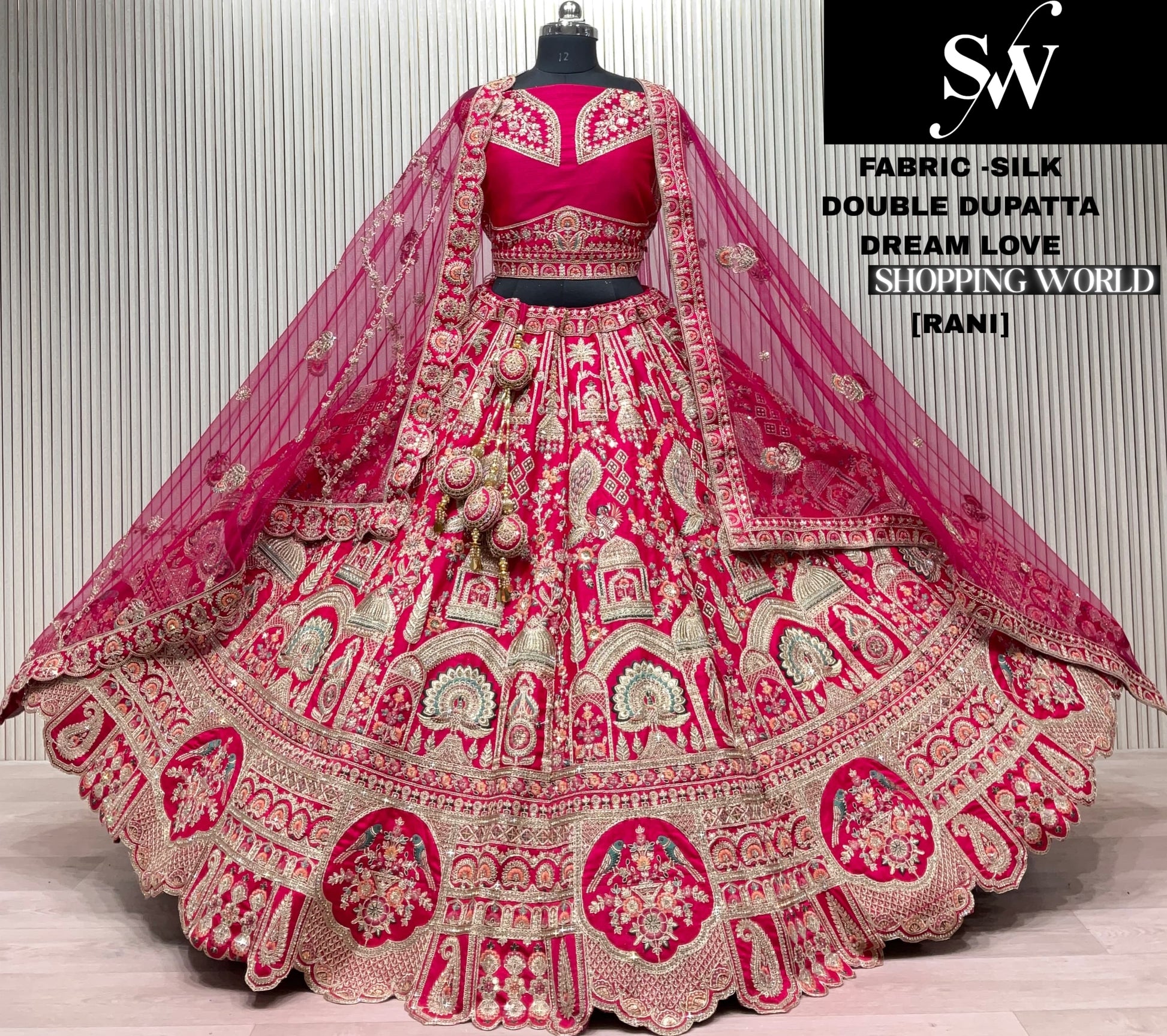 भव्य रानी गुलाबी मोर डबल दुपट्टा सिल्क ब्राइडल लेहंगा, खुश ग्राहक।