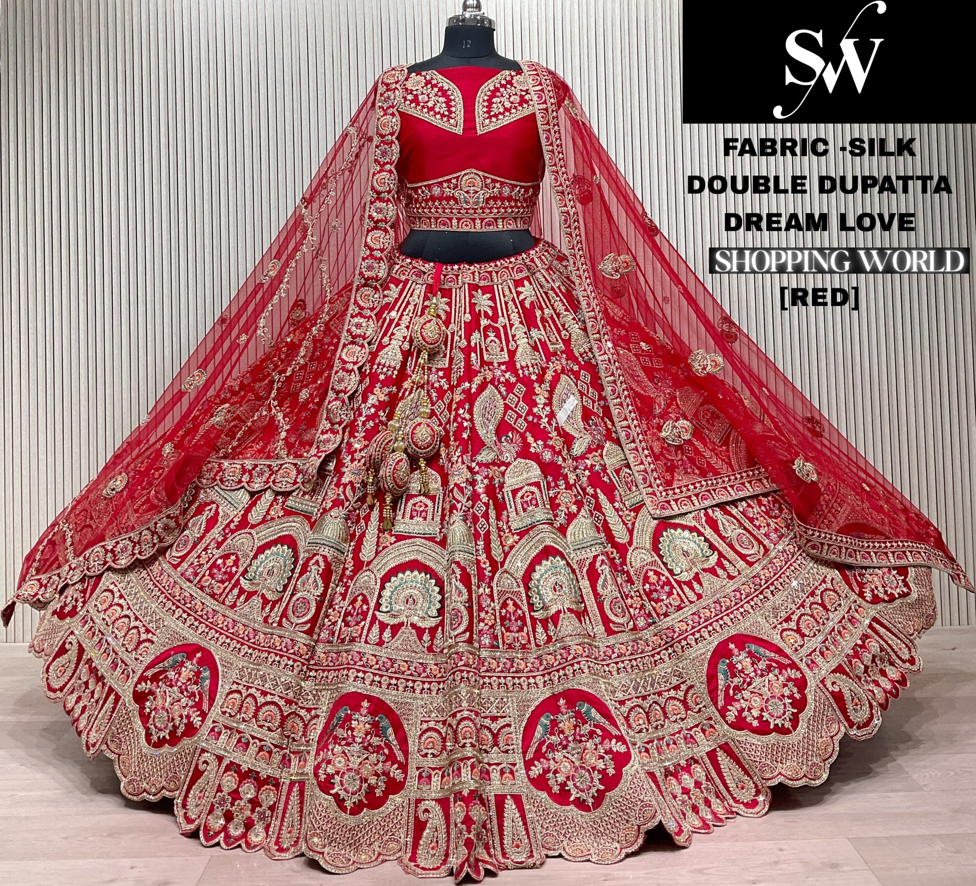 रॉयल रेड ब्राइडल लहंगा डबल टेल दुपट्टा, दुपट्टा देखकर ग्राहक खुश।