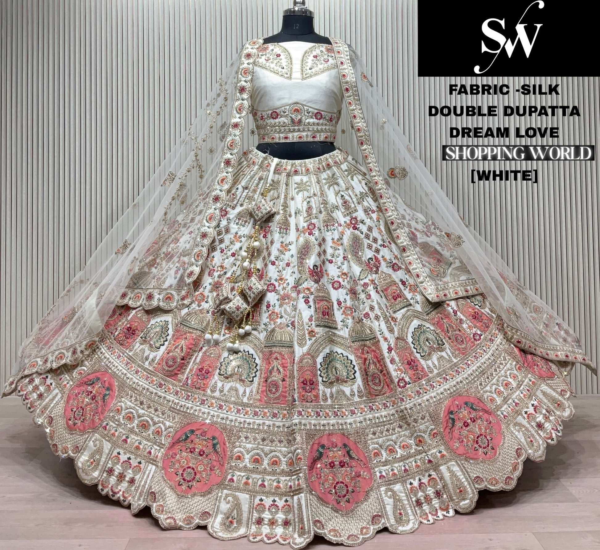 खूबसूरत व्हाइट सिल्क डबल दुपट्टा लहंगा