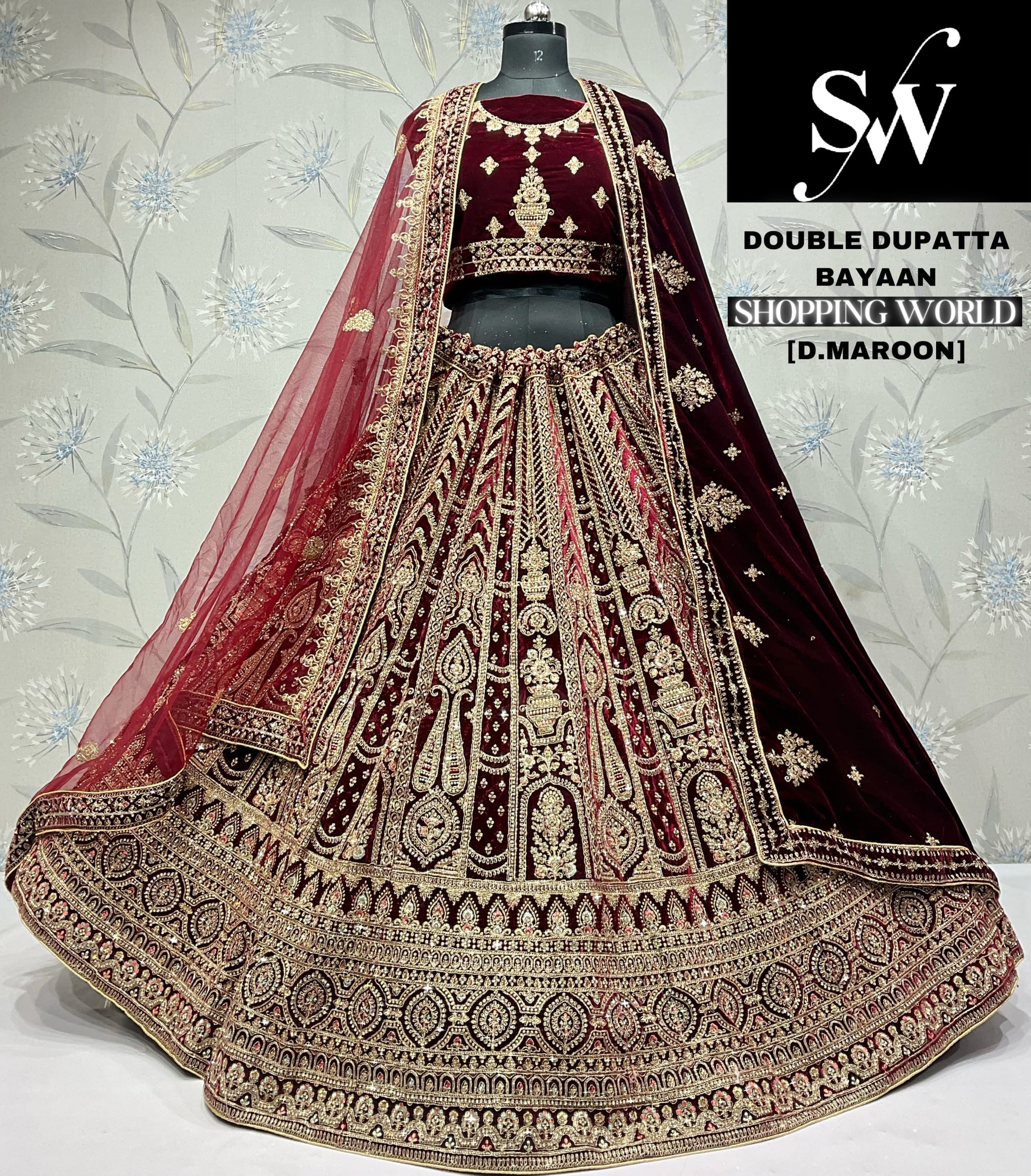 मैजेस्टिक डार्क मैरून मखमली डबल दुपट्टा दुल्हन लहंगा