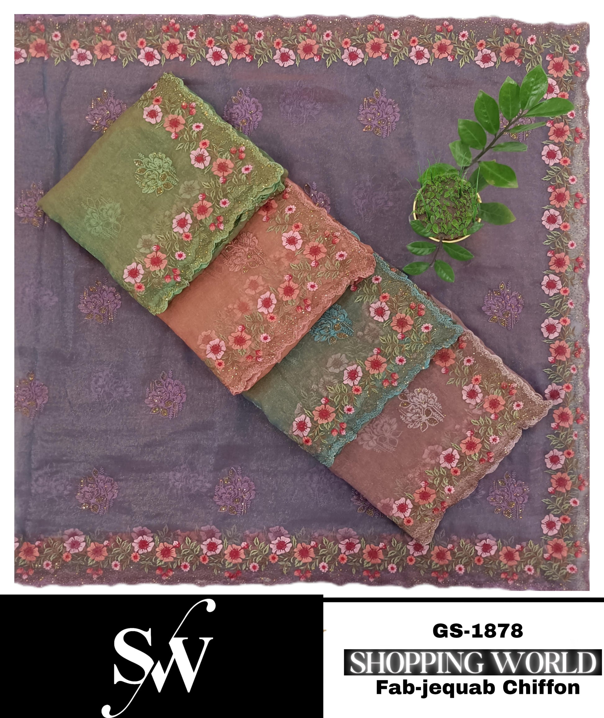 राजसी बैंगनी हरा आड़ू नीला कपड़ा जेक्वाब शिफॉन