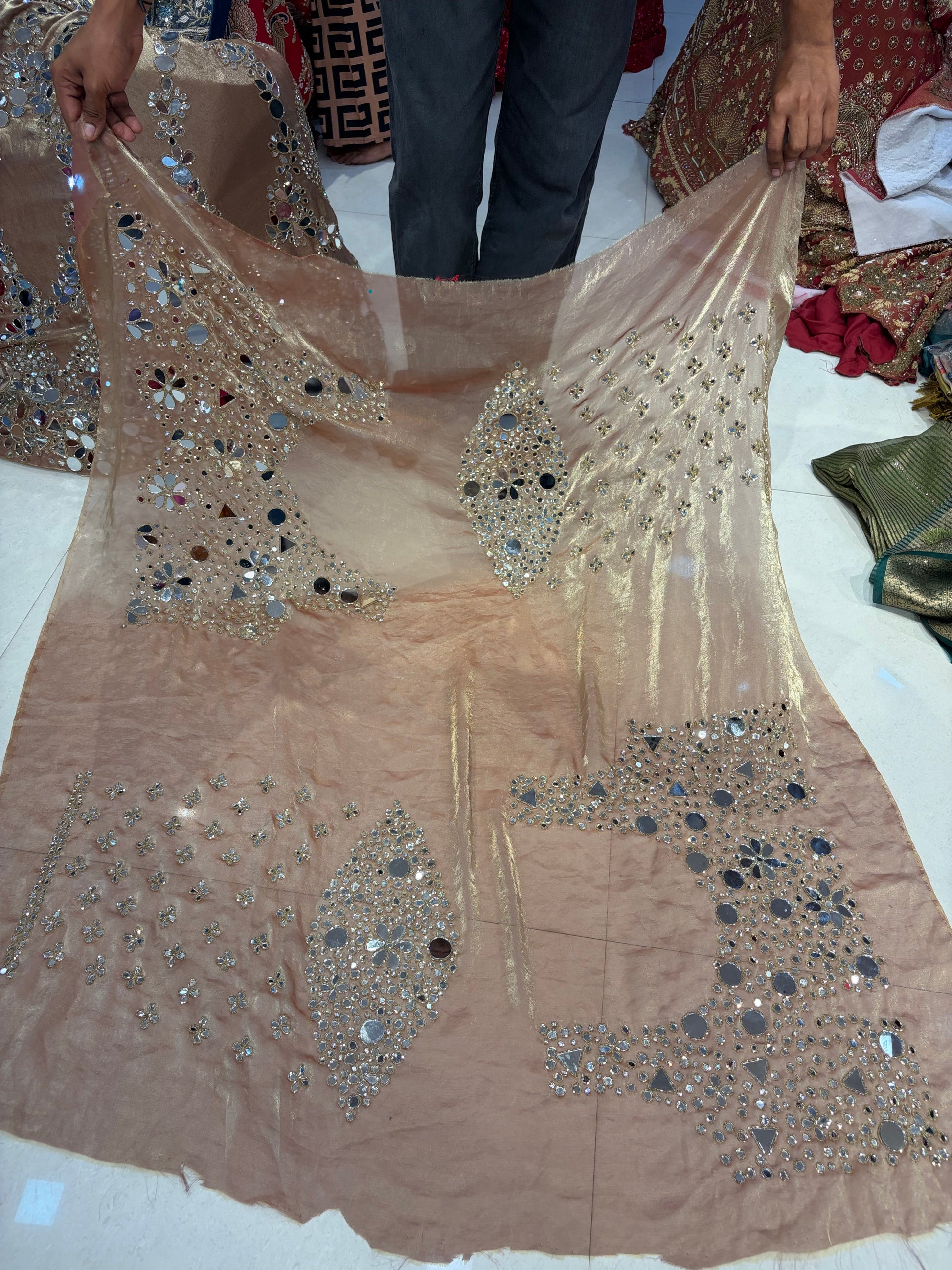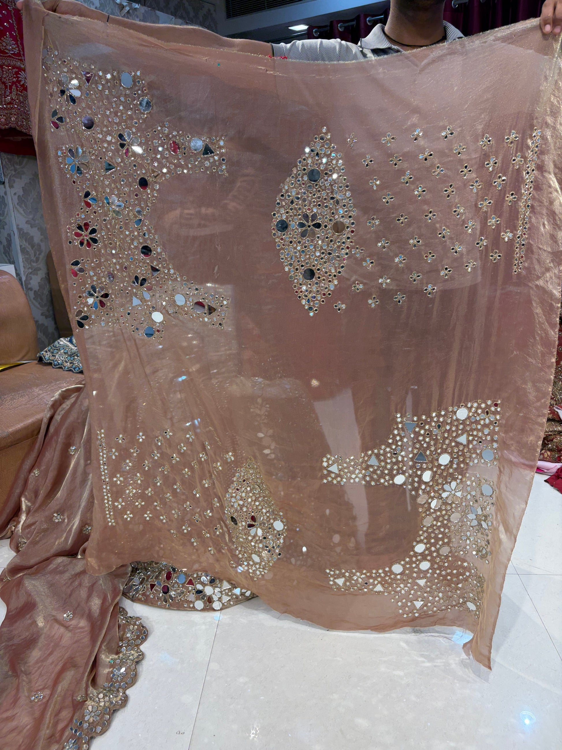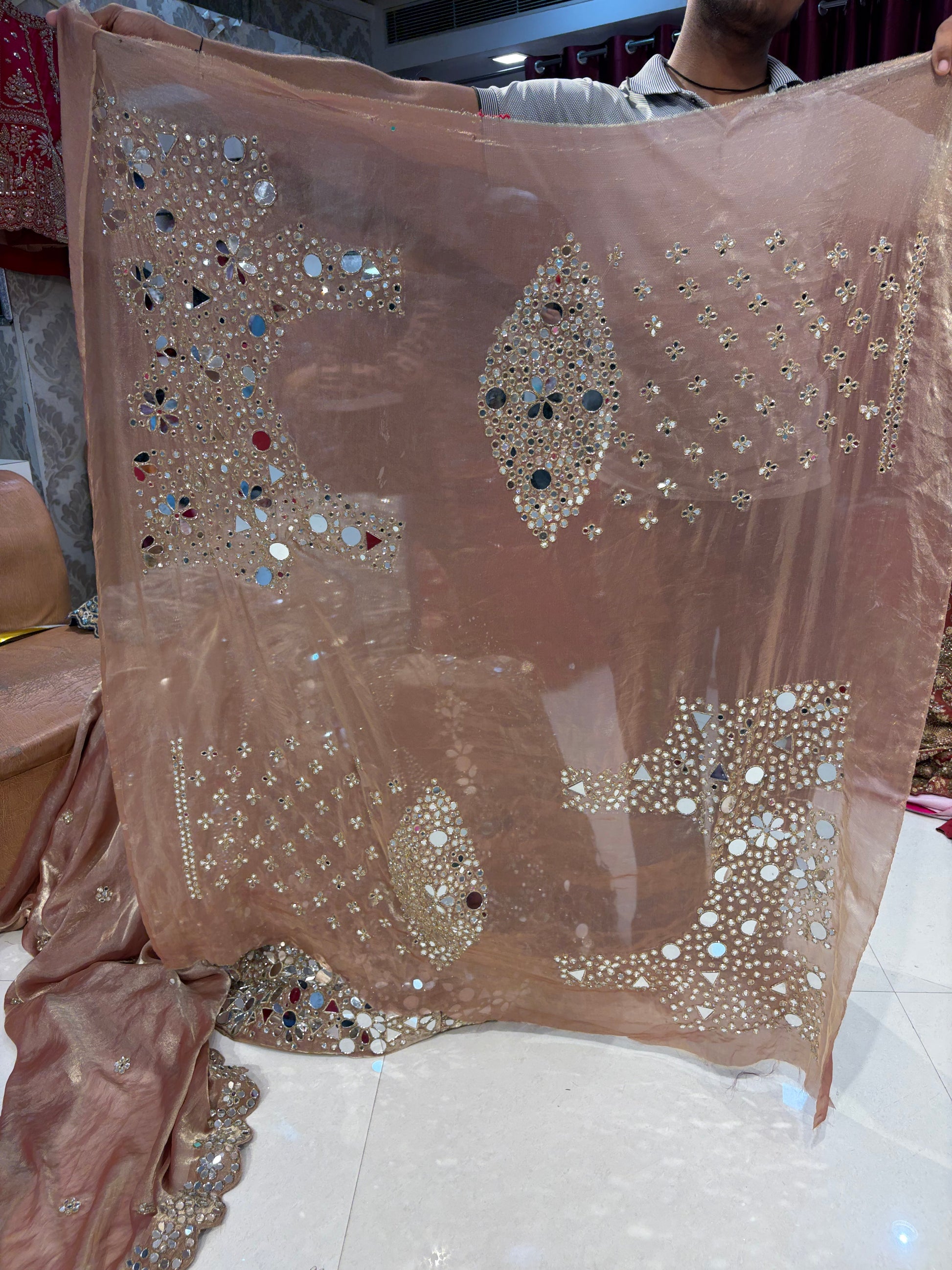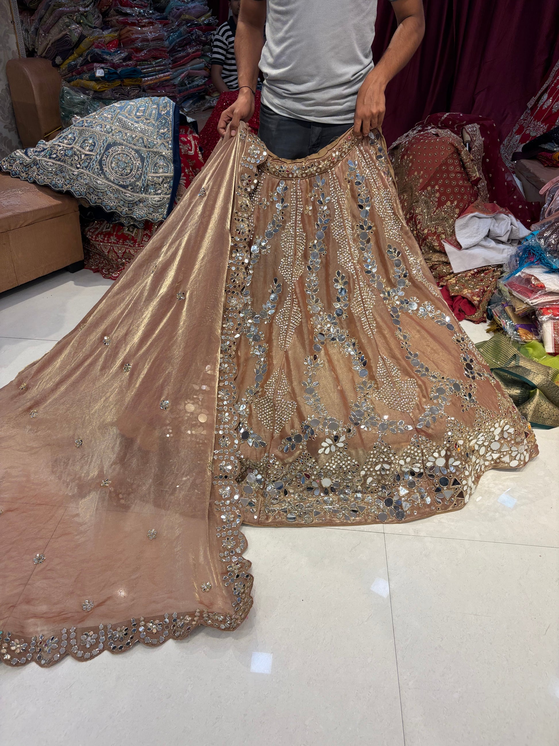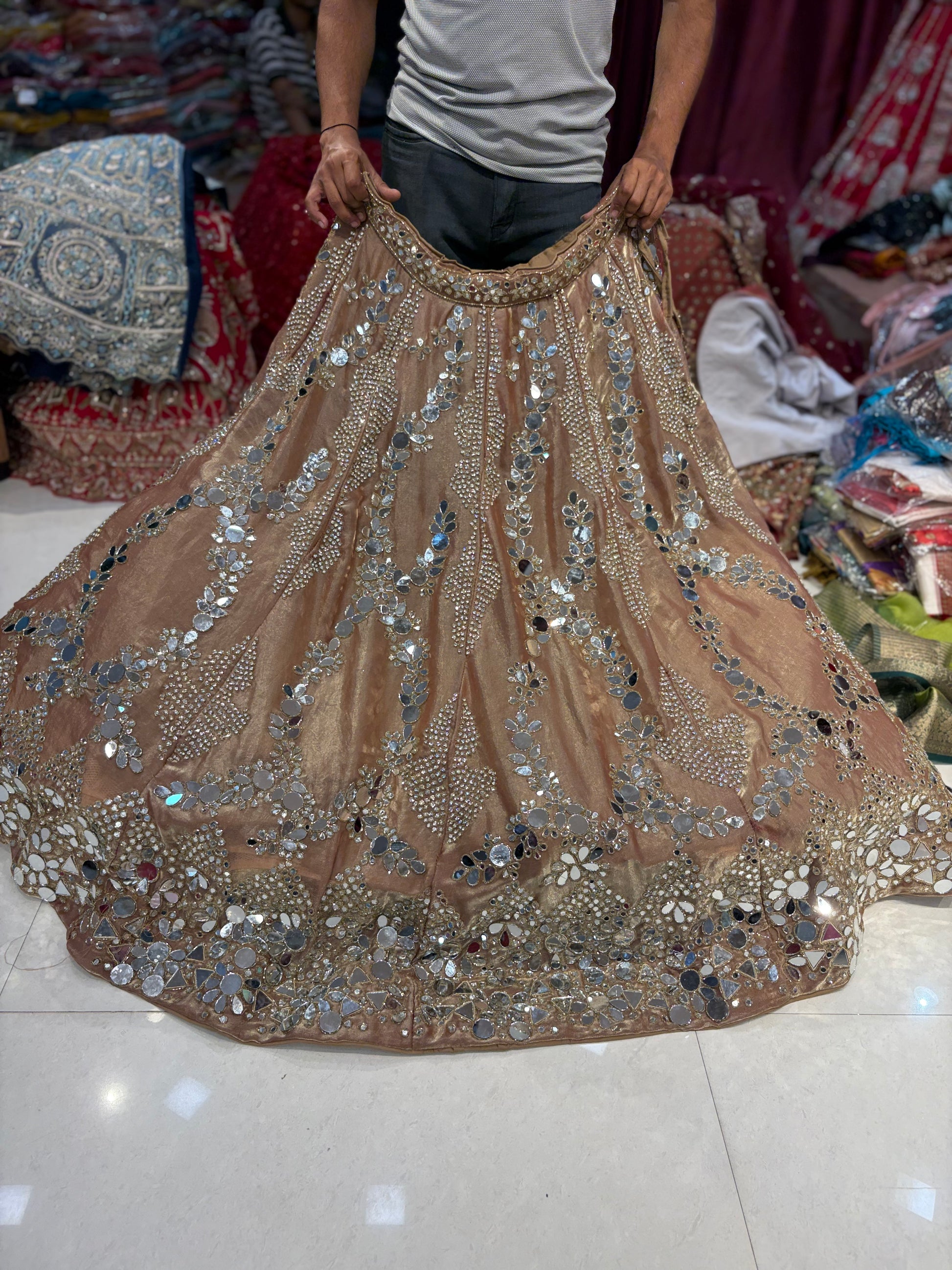 गोल्डन पीच मिरर हैंडवर्क लहंगा