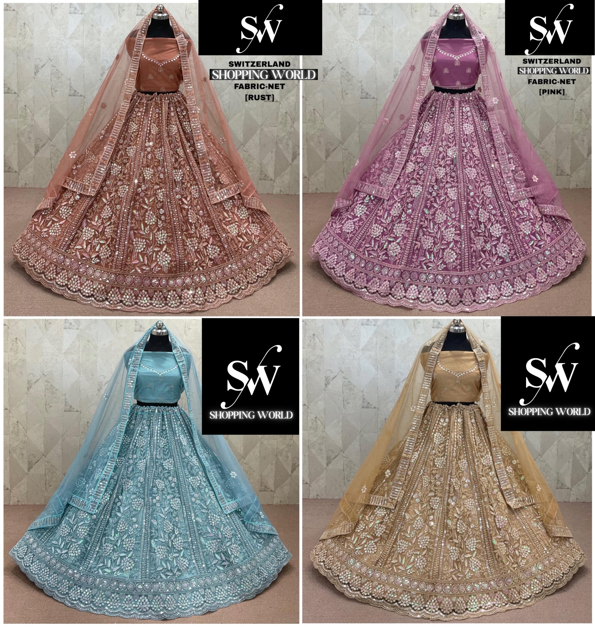 रस्ट ब्राउन पिंक स्काई ब्लू चीकू गोल्डन नेट लहंगा