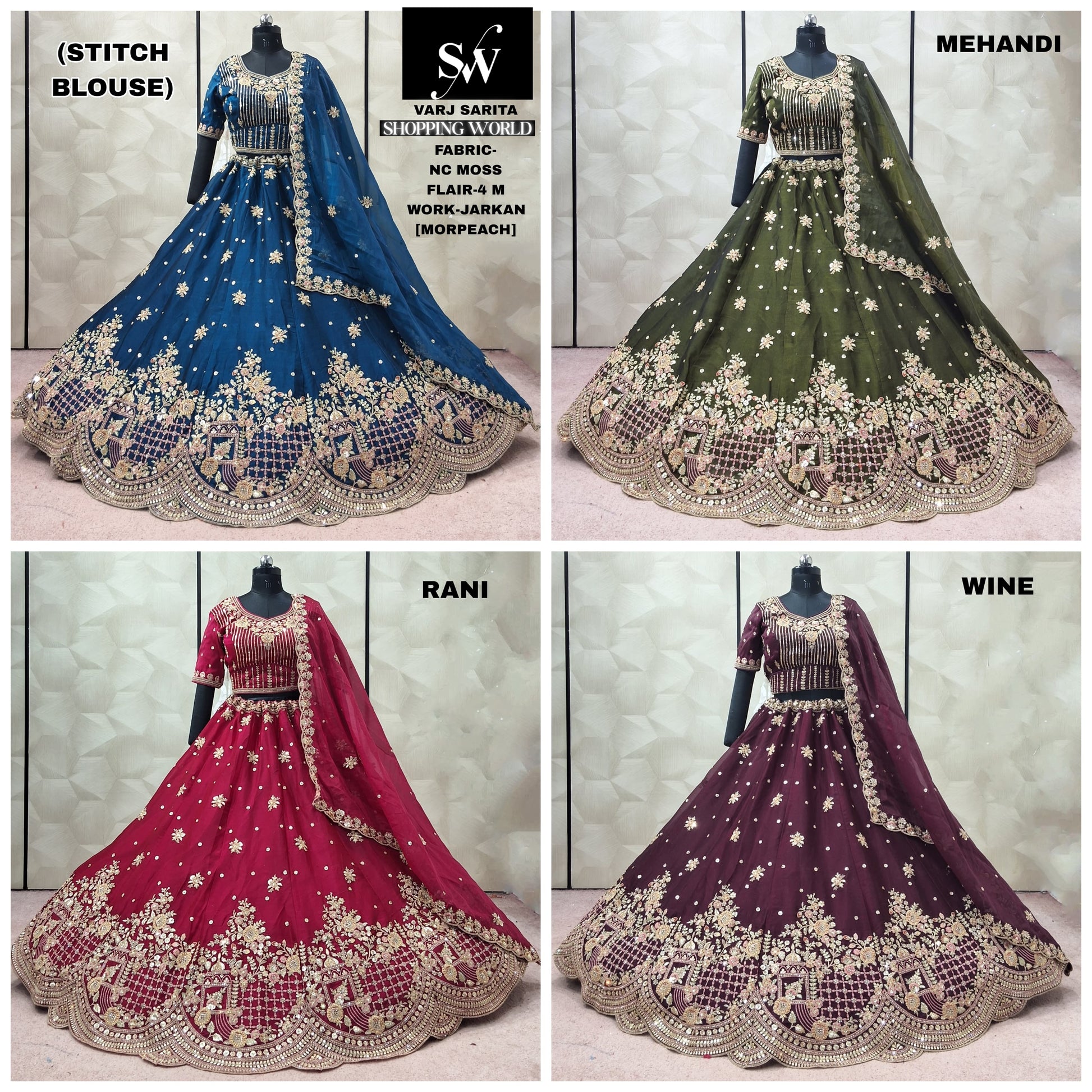 Morpeach Blue Mehendi Green Rani pink Wine Nc Moss Lehenga