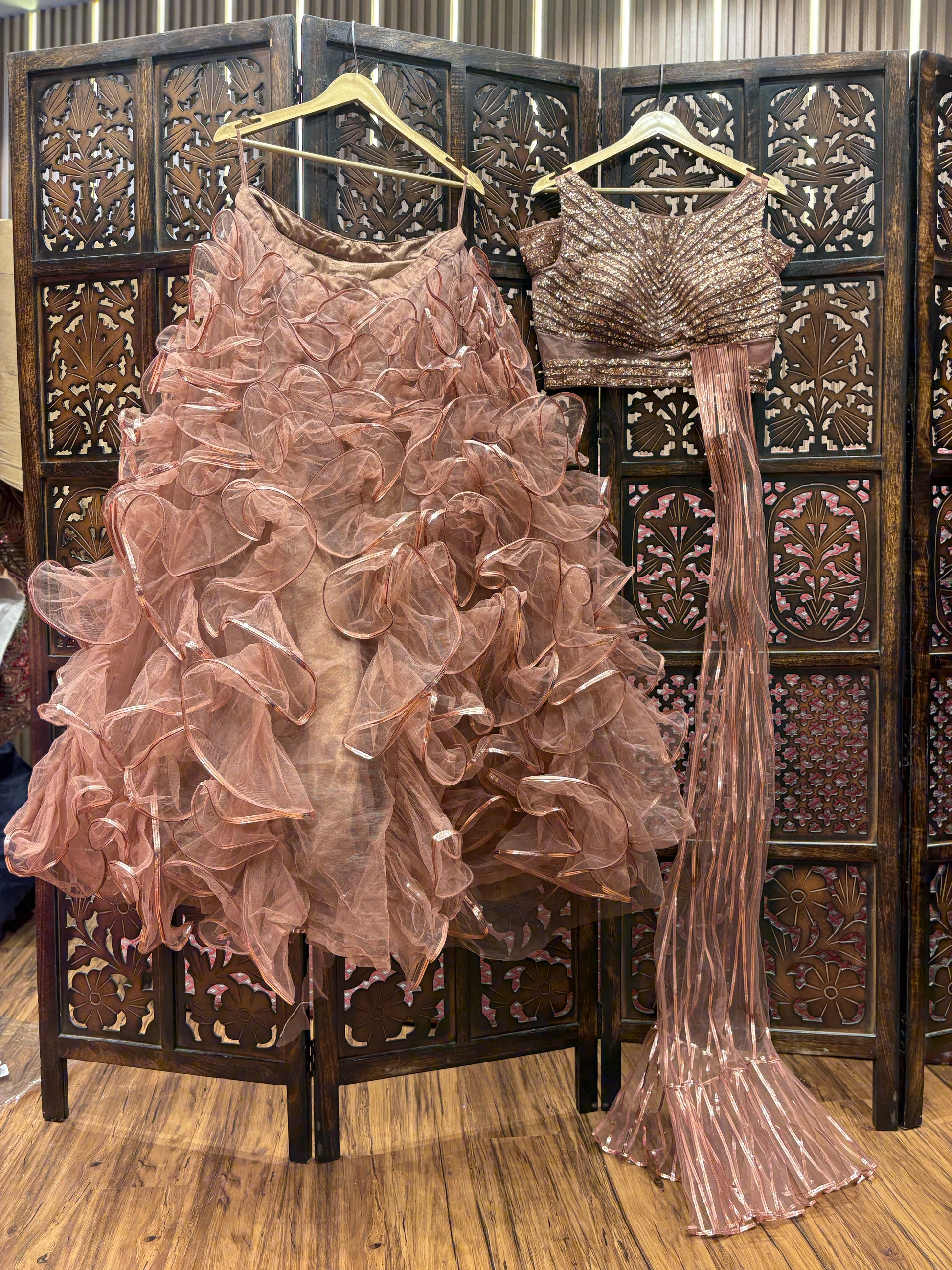 Delightful peach Frill crop top Lehenga