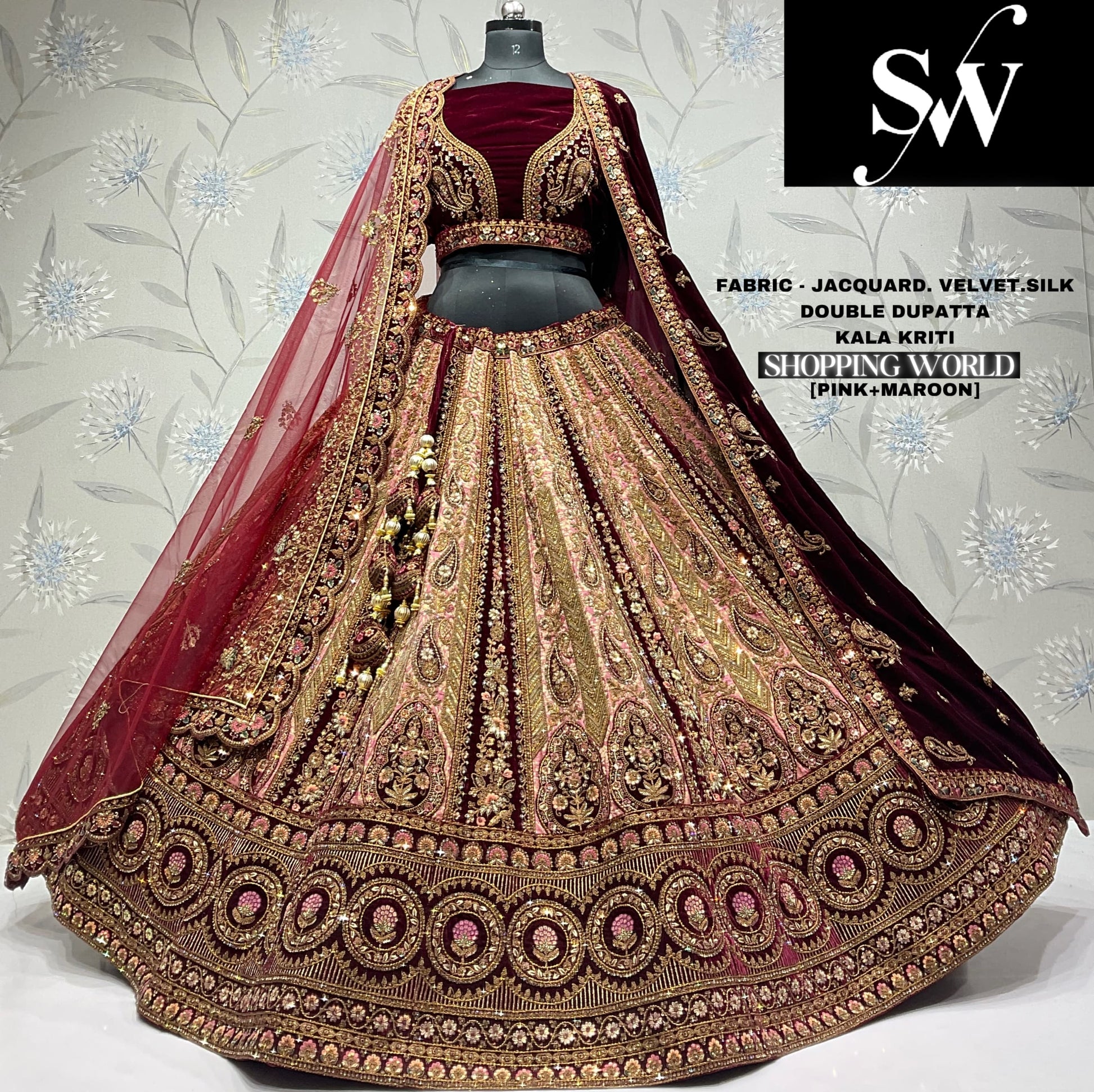 Lovely jacquard Velvet silk Rani maroon Double dupatta Bridal Lehenga