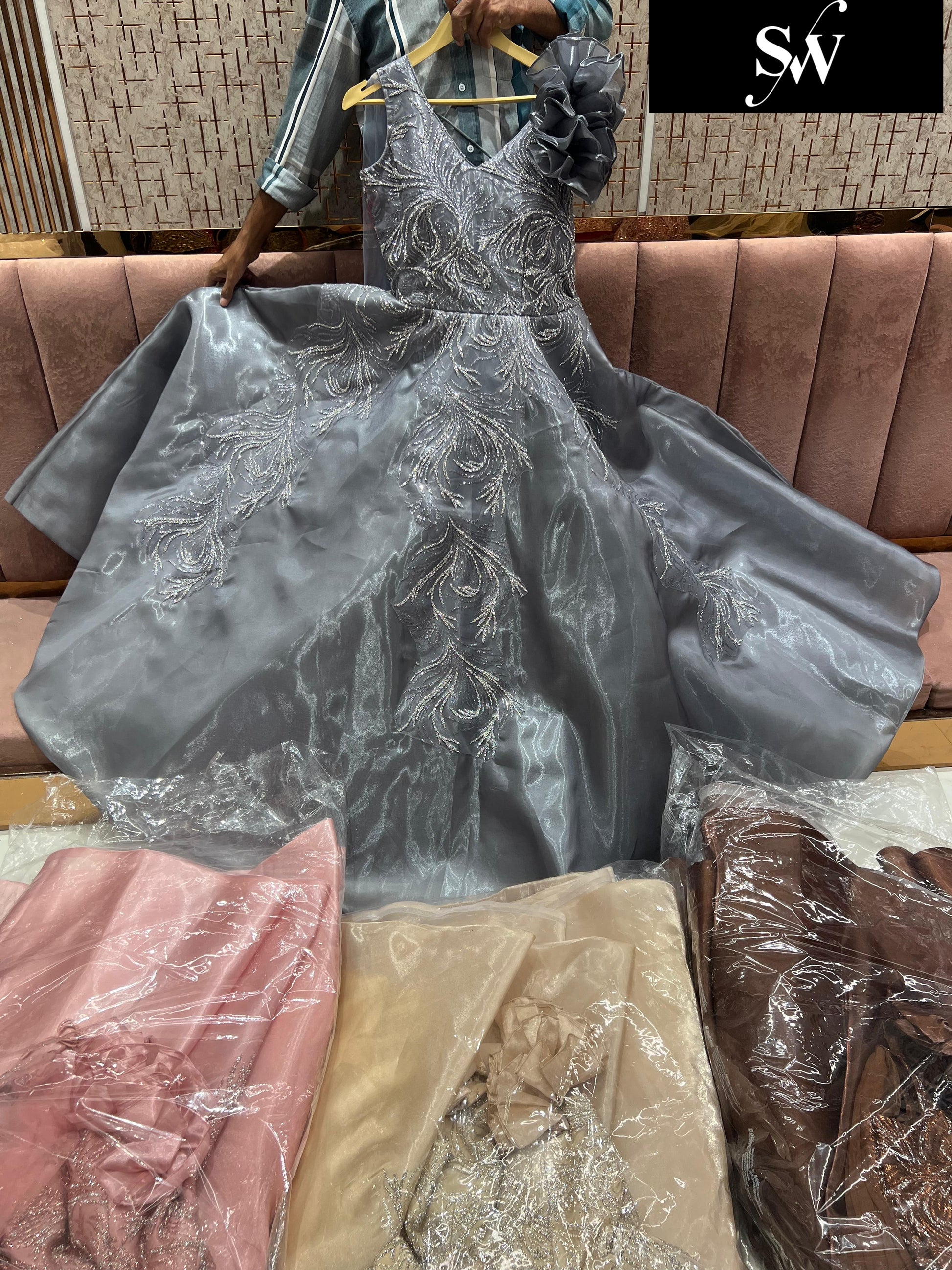 Discover elegance with our Designer Gown Collection, perfect for every special occasion. These free-size gowns are Designed to enhance your wardrobe, gown features intricate embroidery, luxurious fabrics, and a flattering silhouette, making it an ideal choice for weddings, cocktail parties, receptions, and festive celebrations.