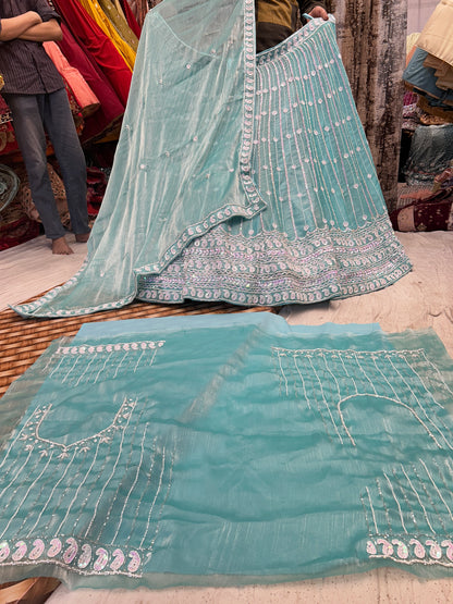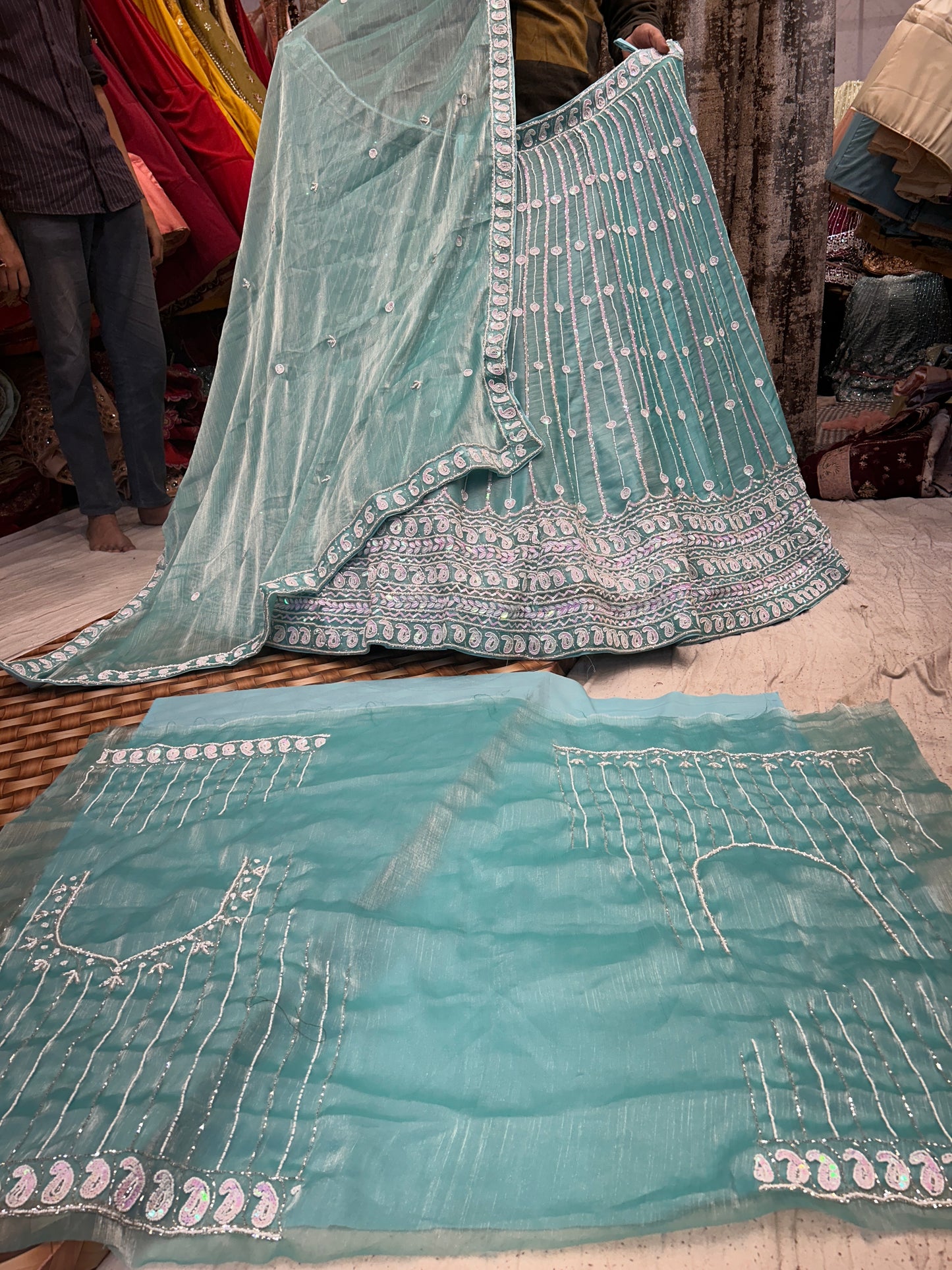 Discover elegance with our Designer Lehenga Collection, perfect for any occasion. These free-size lehengas are thoughtfully designed to accommodate all body types and can be customized to suit your unique style. Crafted to elevate your wardrobe, each lehenga set includes a semi-stitched skirt, unstitched blouse fabric (choli), and a matching chunni (dupatta), making it an ideal choice for weddings, festivals, and special celebrations.