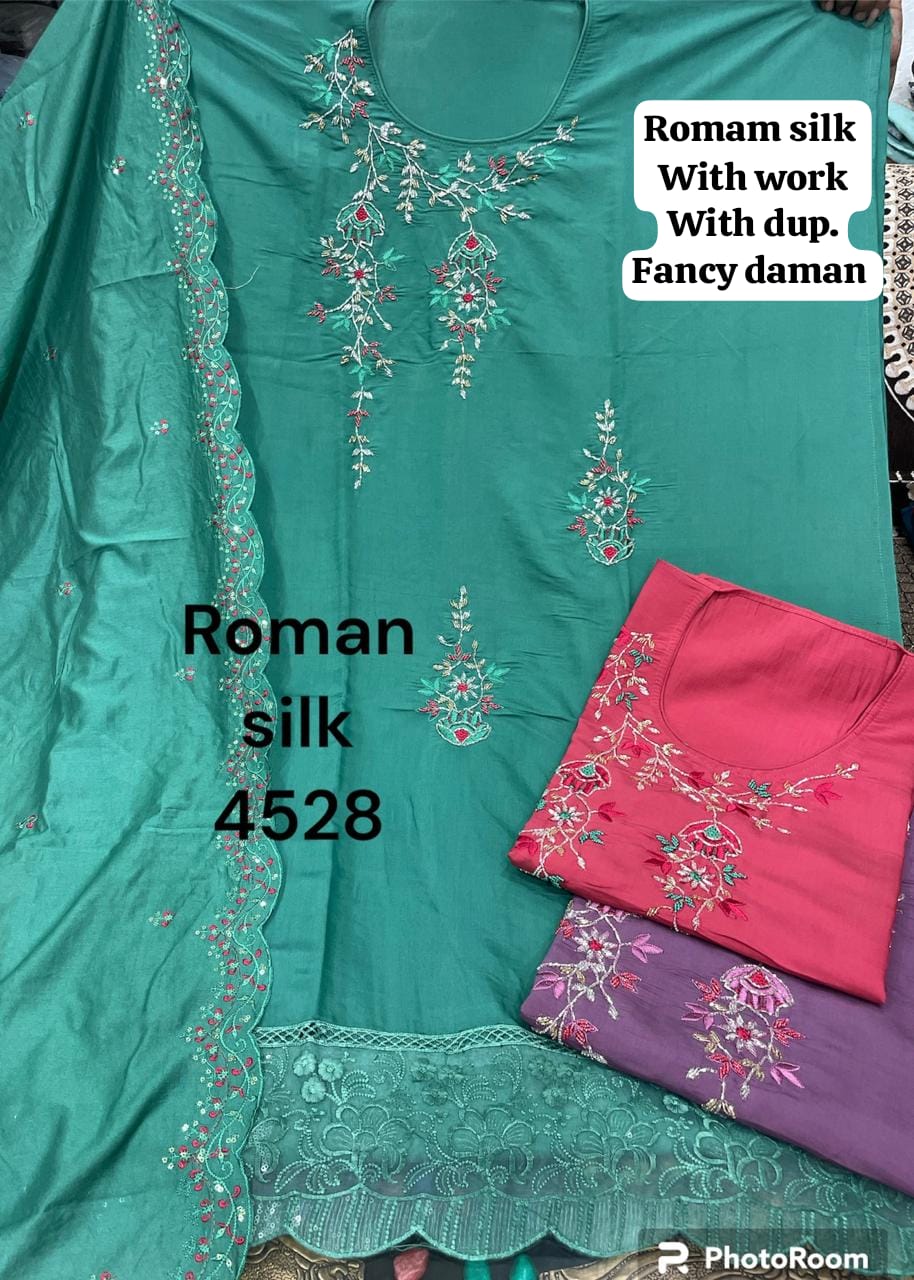 Attractive green roman silk unstitched Salwar suits dress material (free size)