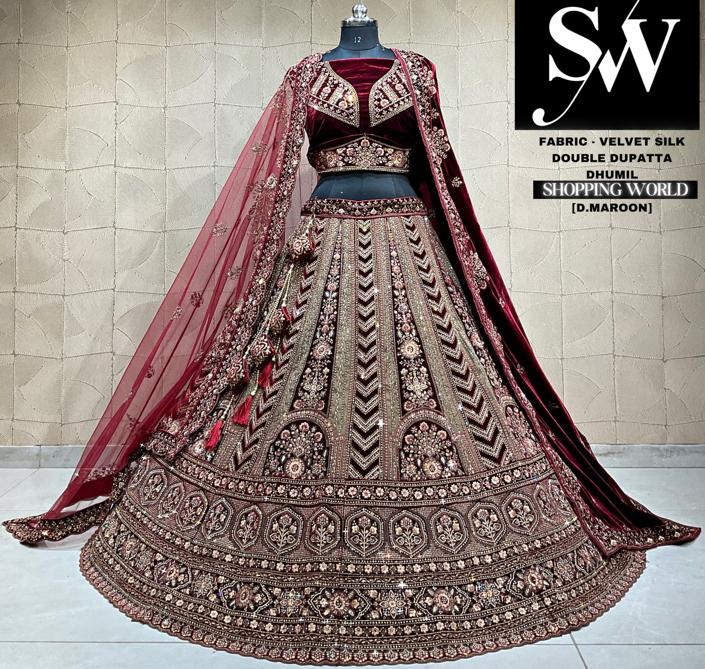 Beautiful dark maroon double dupatta velvet silk bridal lehenga