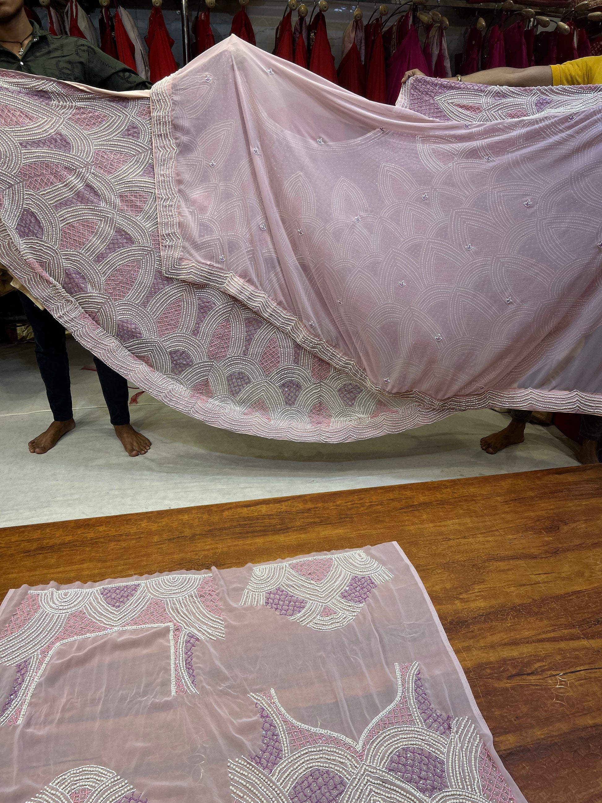 In 2025, pastel tones, floral embroidery, mirror work, and Indo-fusion layers are trending, often paired with coordinated safas and mojris