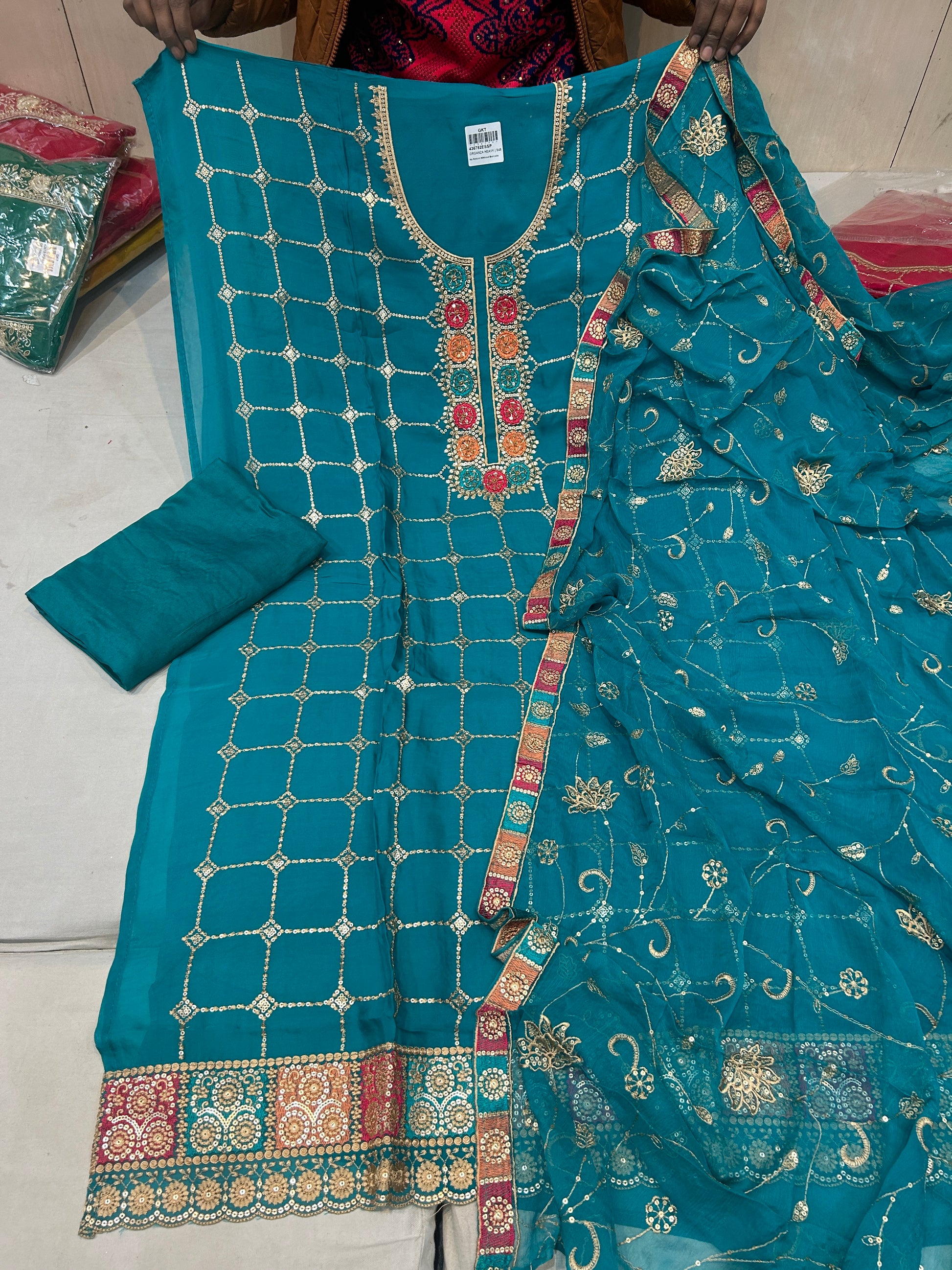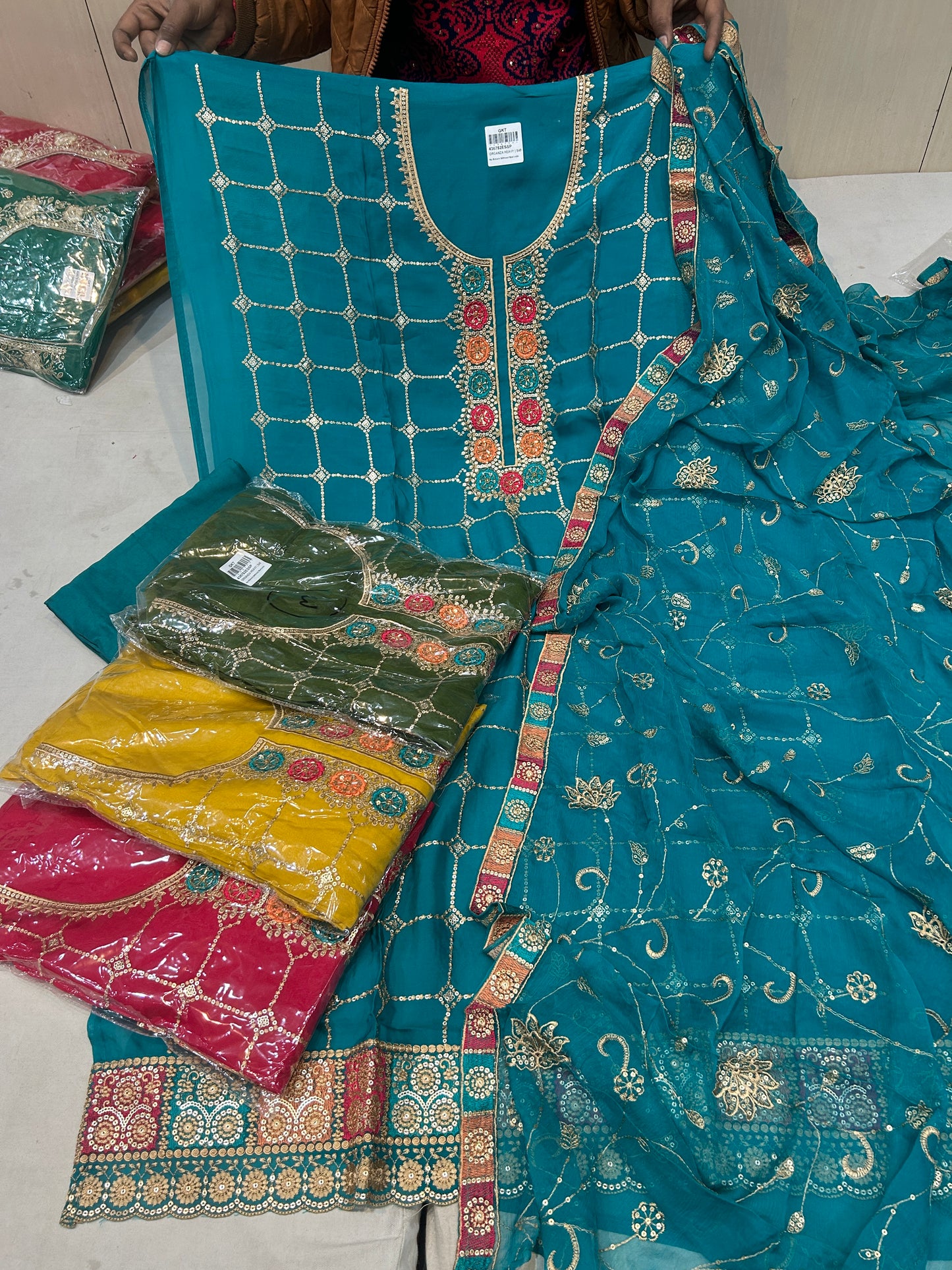 We have an extensive collection of Anarkali suits, palazzo suits, straight-cut suits, Punjabi salwar suits, and party-wear salwar suits in various fabrics and designs.