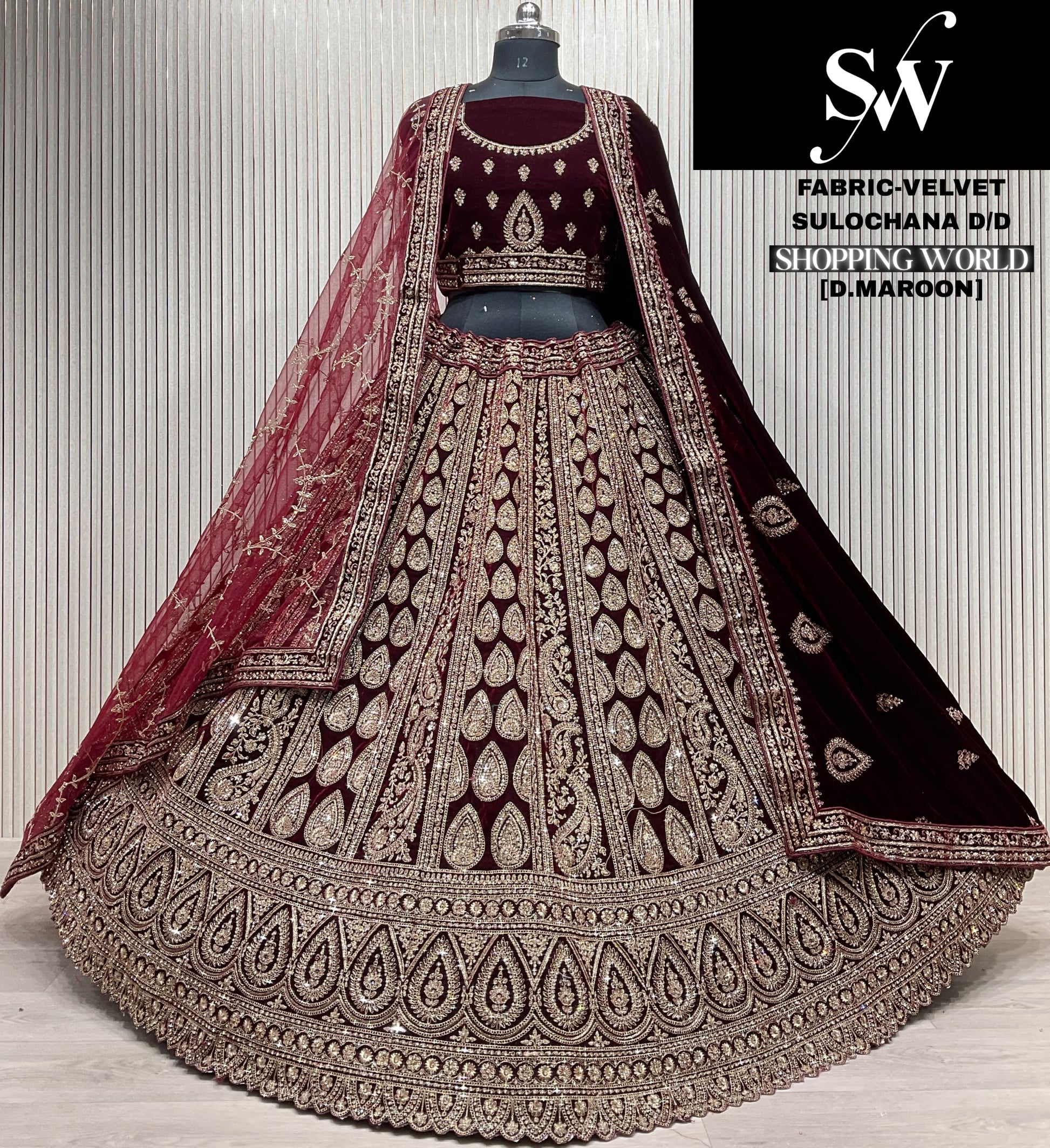 Charming Raspberry Dark Red Double duptta Velvet Bridal Lehenga