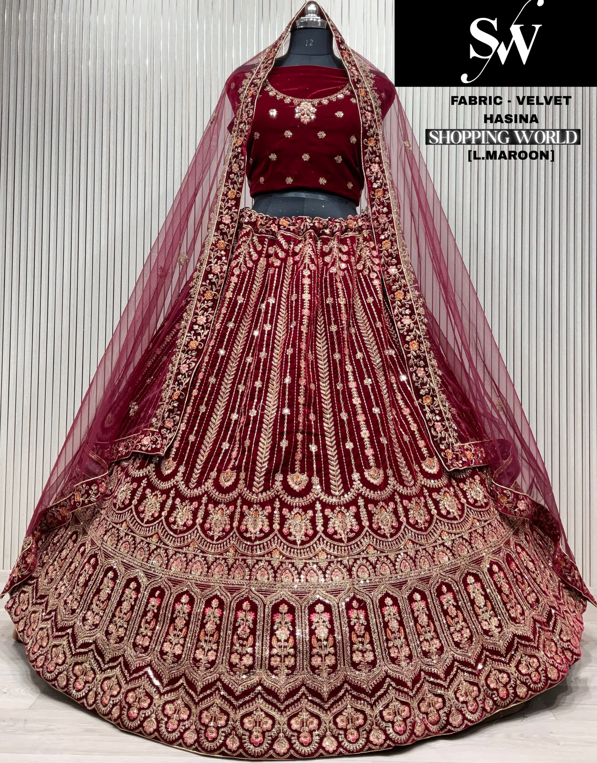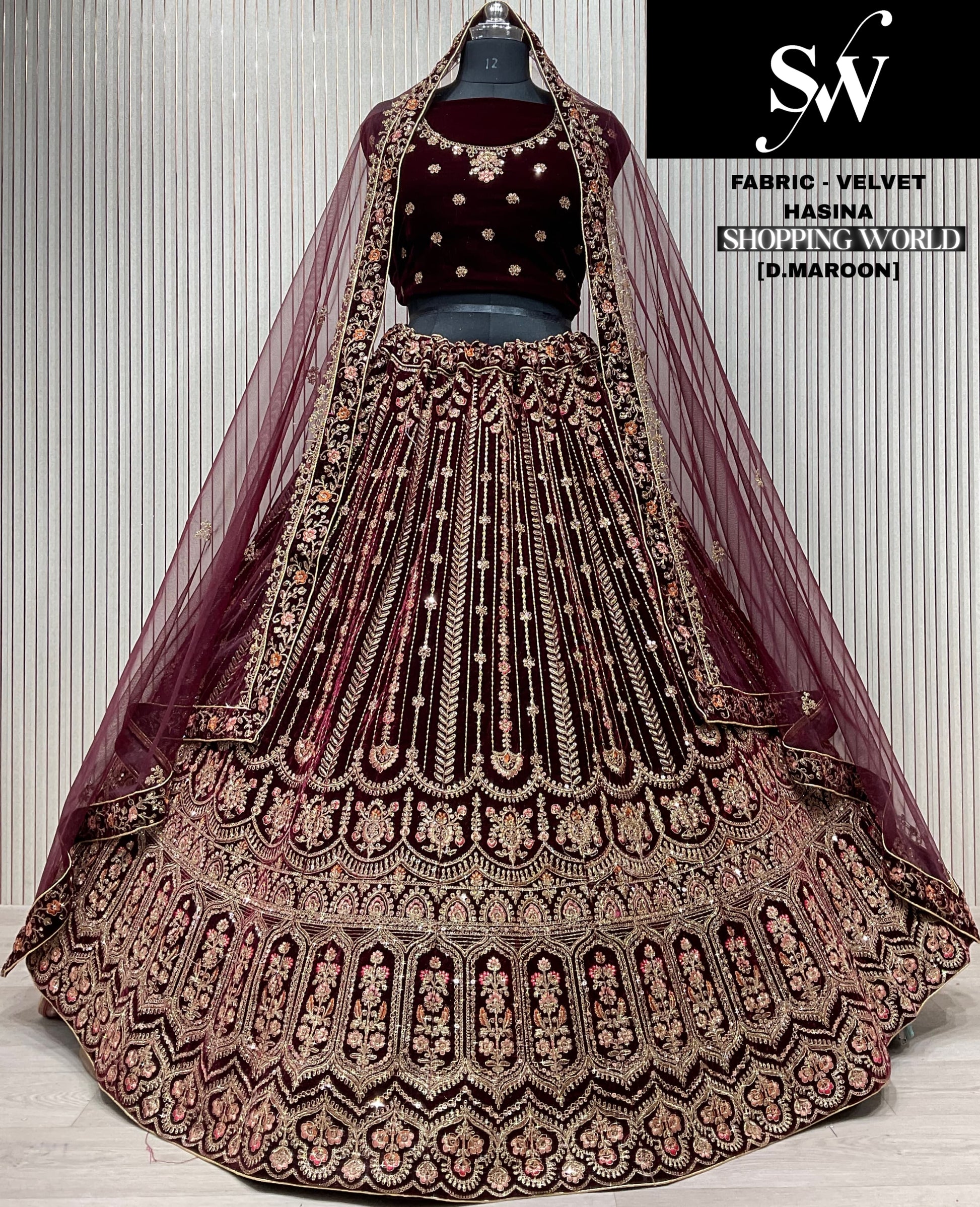 Delightful Dark maroon Double duptta Velvet Bridal Lehenga