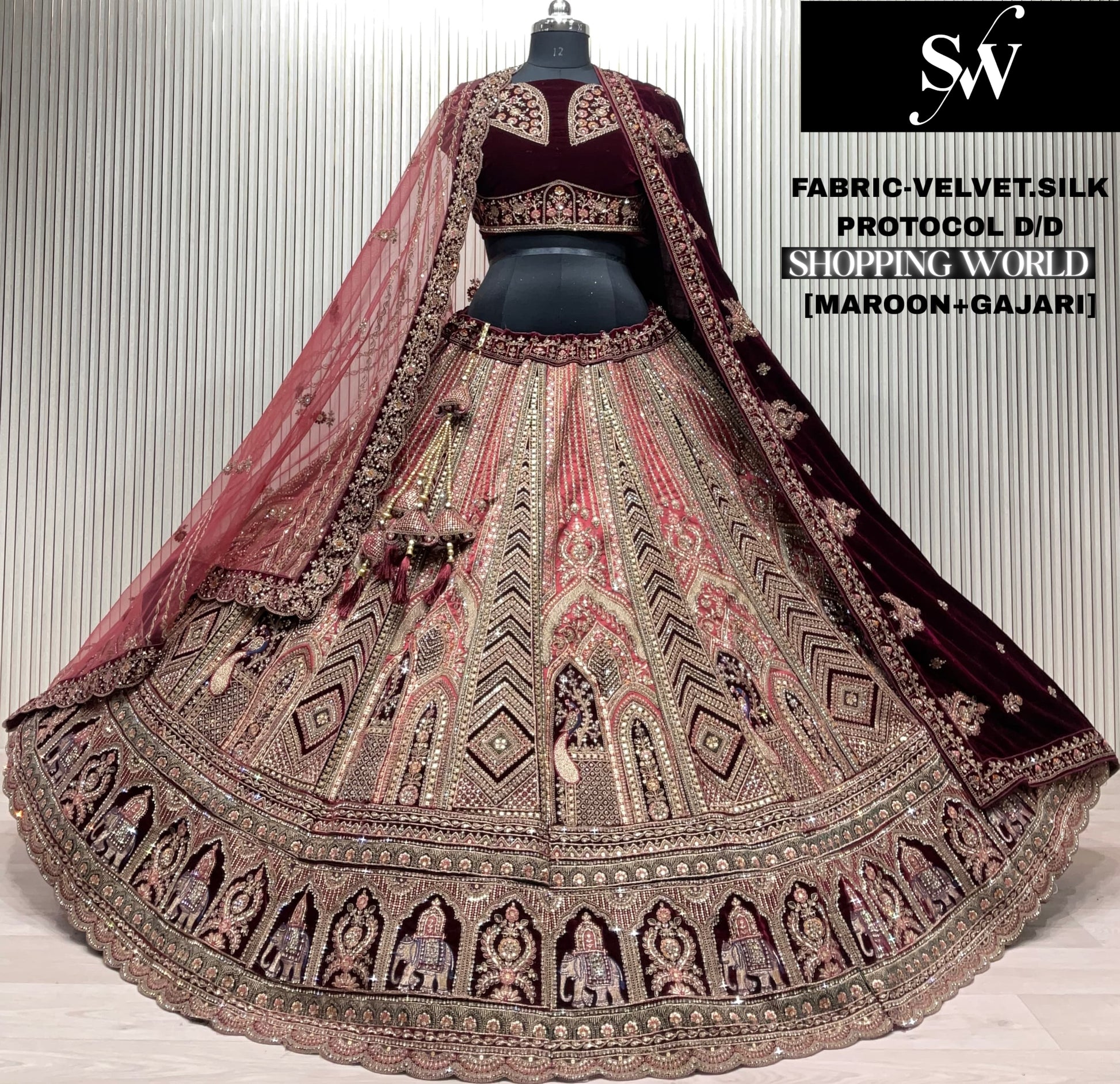 Delightful maroon Chiku golden Double Duptta Velvet Silk Bridal Lehenga