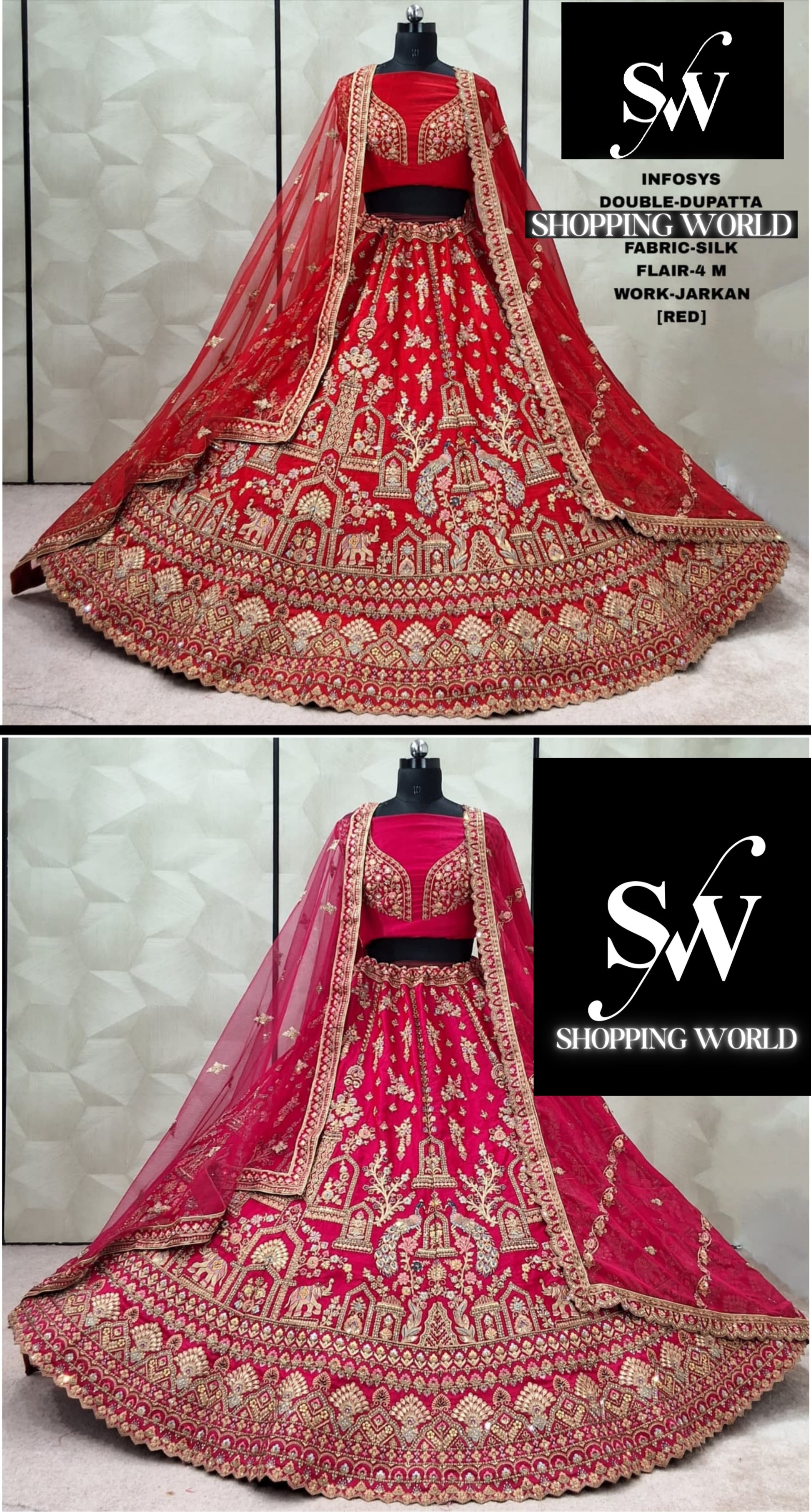 Elegant Red Rani pink peacock Double Duptta Silk Bridal Lehenga