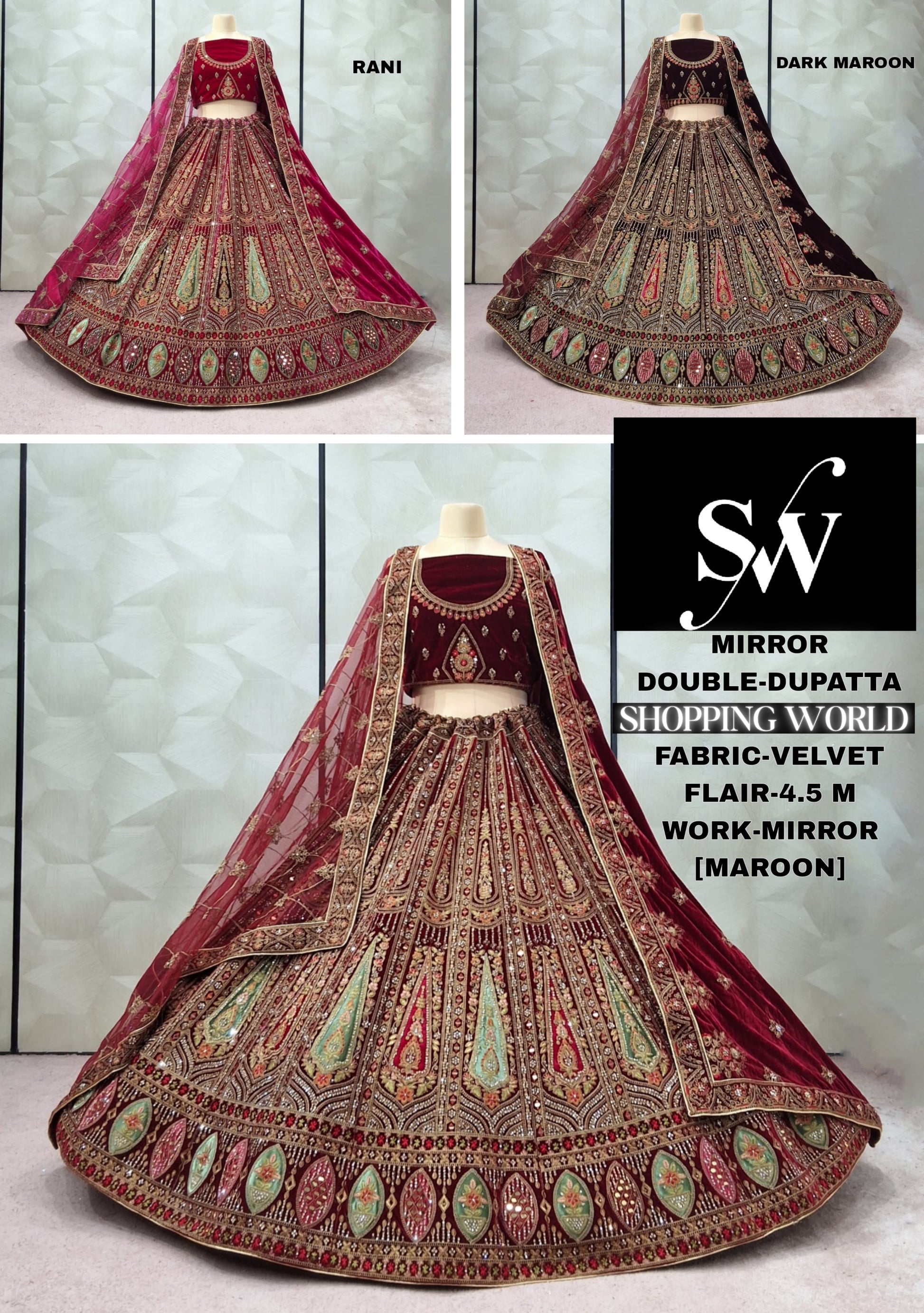 Embellished Maroon Dark Maroon Rani pink Velvet Bridal Lehenga
