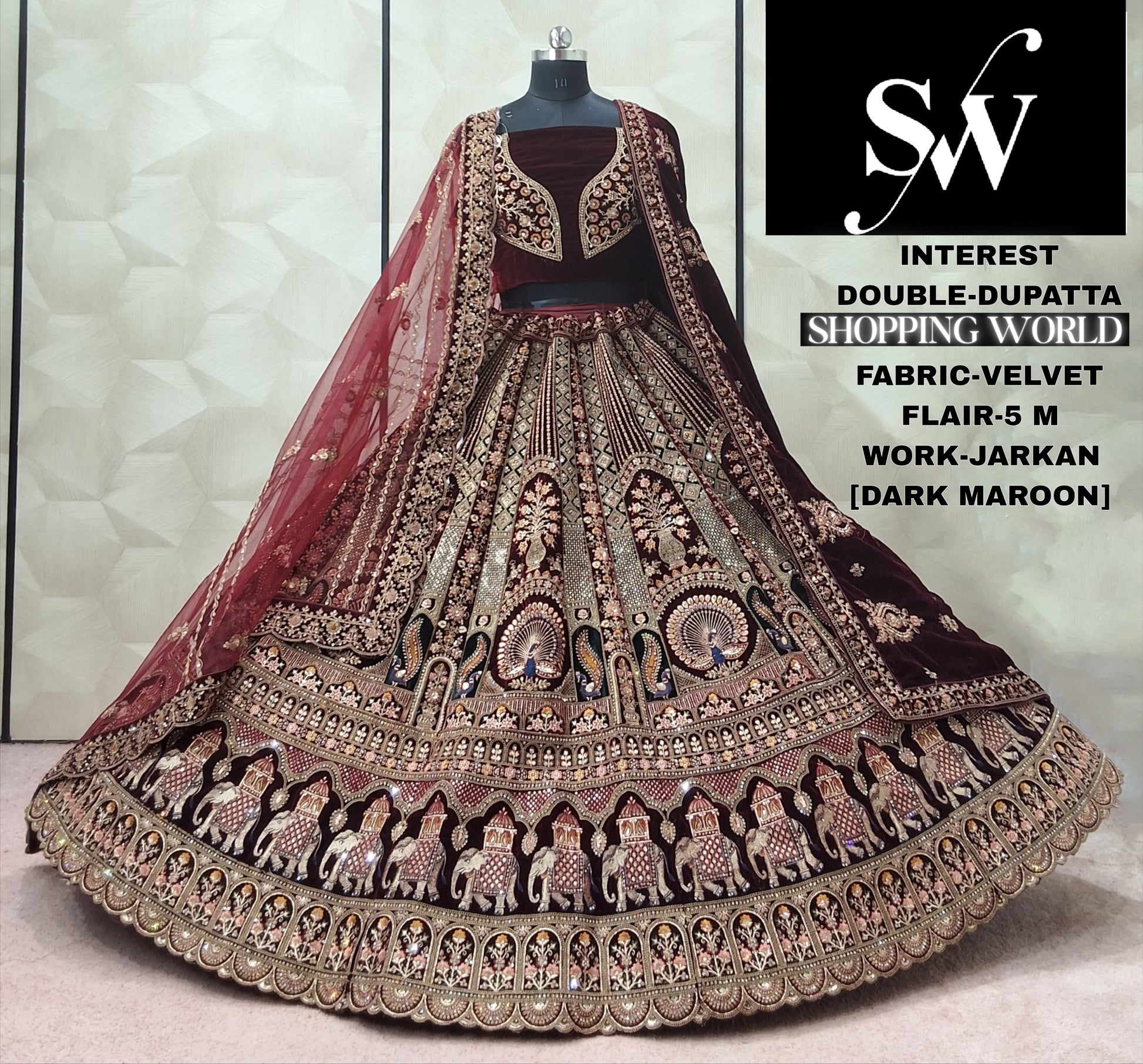 Fabulous Maroon Rani pink Dark Maroon peacock Velvet Double Dupatta Bridal Lehenga