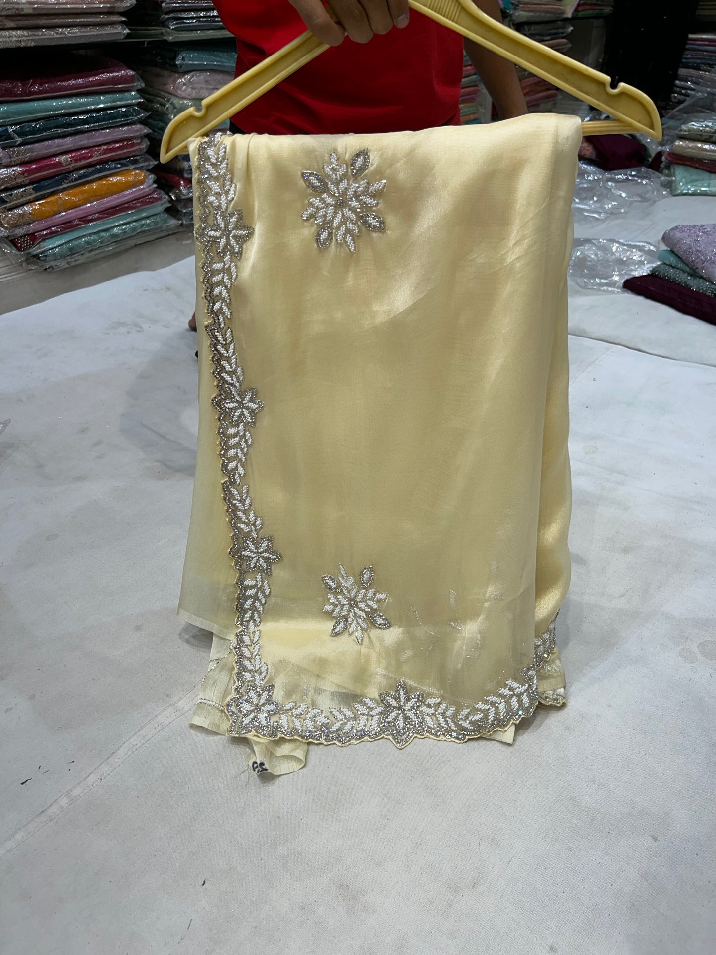 Fabulous light yellow peach fancy saree